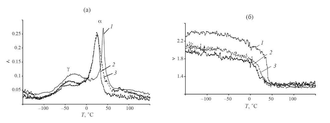 Рис. 1. Спектры внутреннего трения λ=f(T) (а), температурно-частотные зависимости ν=f(T) (б) образцов ПВС (1), ПВС+ Ag+ (2), ПВС+ Ag после УФ-облучения (3).