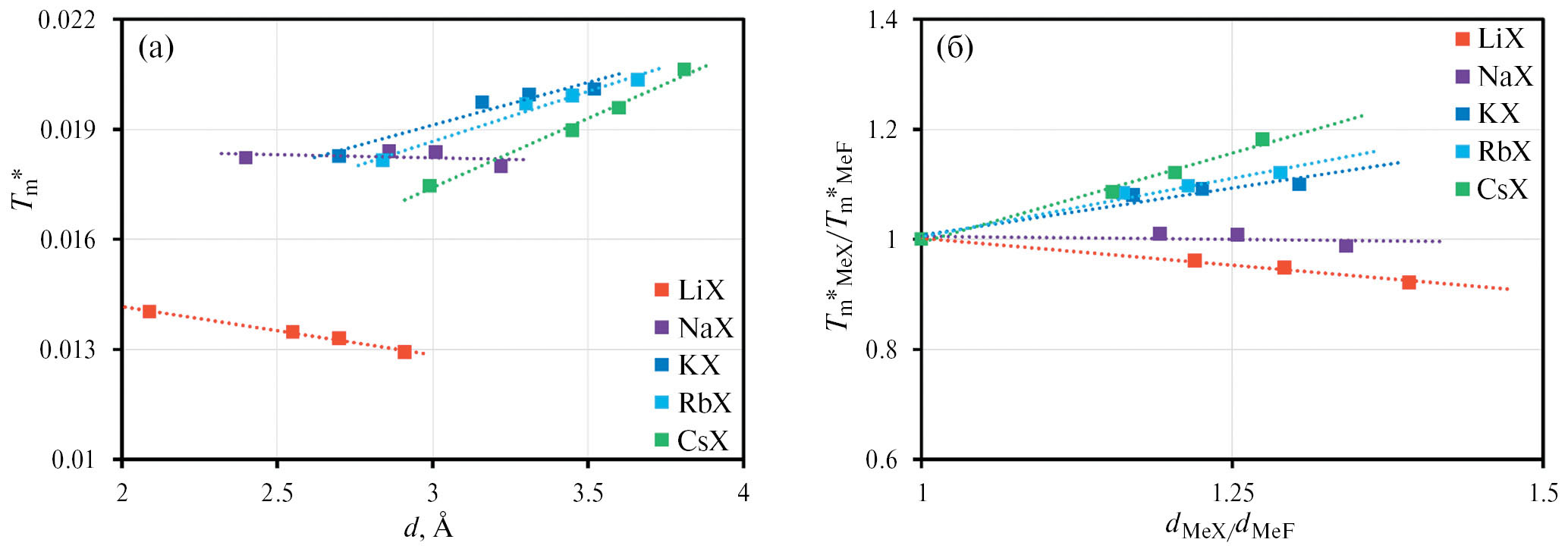 Рис. 1. Экспериментальные значения приведенных температур плавления галогенидов щелочных металлов Tₘ*=kBTₘε₀d/e² в зависимости от суммы радиусов катионов и анионов индивидуальных солей d (а); а также значения приведенных температур плавления галогенидов лития, натрия, калия, рубидия и цезия, отнесенные к температурам плавления соответствующих фторидов щелочных металлов в зависимости от отношений суммы радиусов ионов каждой соли к сумме радиусов ионов аналогичных фторидных солей (б).