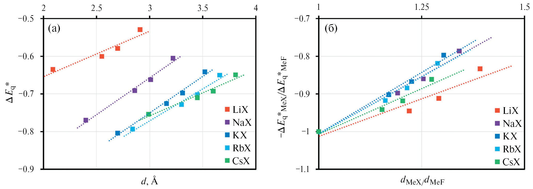 Рис. 3. Результаты расчетов кулоновского вклада в приведенную внутреннюю энергию расплавленных галогенидов щелочных металлов ΔEq*=ΔEqε₀d/e² в зависимости от суммы радиусов катионов и анионов индивидуальных солей d (а); а также значения этого вклада в приведенную внутреннюю энергию расплавленных галогенидов лития, натрия, калия, рубидия и цезия, отнесенные к кулоновскому вкладу во внутреннюю энергию соответствующих фторидов щелочных металлов в зависимости от отношений суммы радиусов ионов каждой соли к сумме радиусов ионов аналогичных фторидных солей (б).