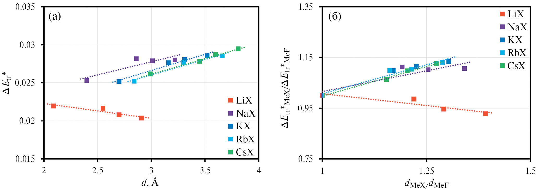 Рис. 4. Результаты расчетов поступательного вклада в приведенную внутреннюю энергию расплавленных галогенидов щелочных металлов ΔEtr*=ΔEtrε₀d/e² в зависимости от суммы радиусов катионов и анионов индивидуальных солей d (а); а также значения этого вклада в приведенную внутреннюю энергию расплавленных галогенидов лития, натрия, калия, рубидия и цезия, отнесенные к поступательному вкладу во внутреннюю энергию соответствующих фторидов щелочных металлов в зависимости от отношений суммы радиусов ионов каждой соли к сумме радиусов ионов аналогичных фторидных солей (б).