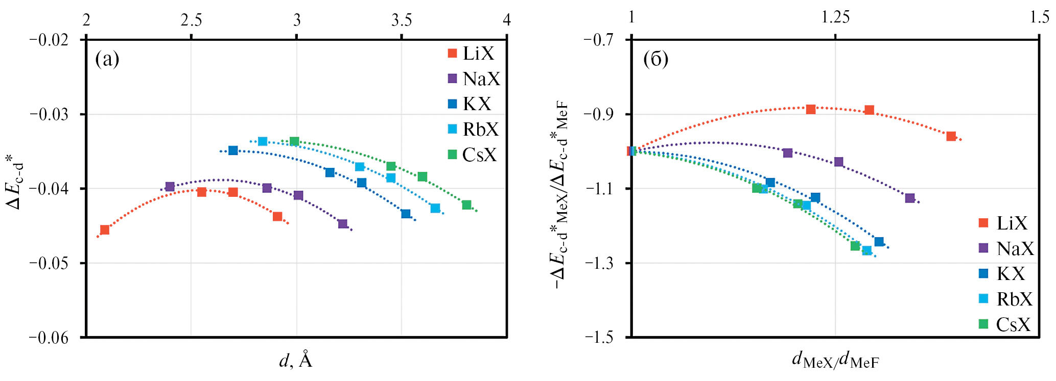 Рис. 5. Результаты расчетов заряд-дипольного вклада в приведенную внутреннюю энергию расплавленных галогенидов щелочных металлов ΔEc-d*= =ΔEc-dε₀d/e² в зависимости от суммы радиусов катионов и анионов индивидуальных солей d (а); а также значения этого вклада в приведенную внутреннюю энергию расплавленных галогенидов лития, натрия, калия, рубидия и цезия, отнесенные к заряд-дипольному вкладу во внутреннюю энергию соответствующих фторидов щелочных металлов в зависимости от отношений суммы радиусов ионов каждой соли к сумме радиусов ионов аналогичных фторидных солей (б).