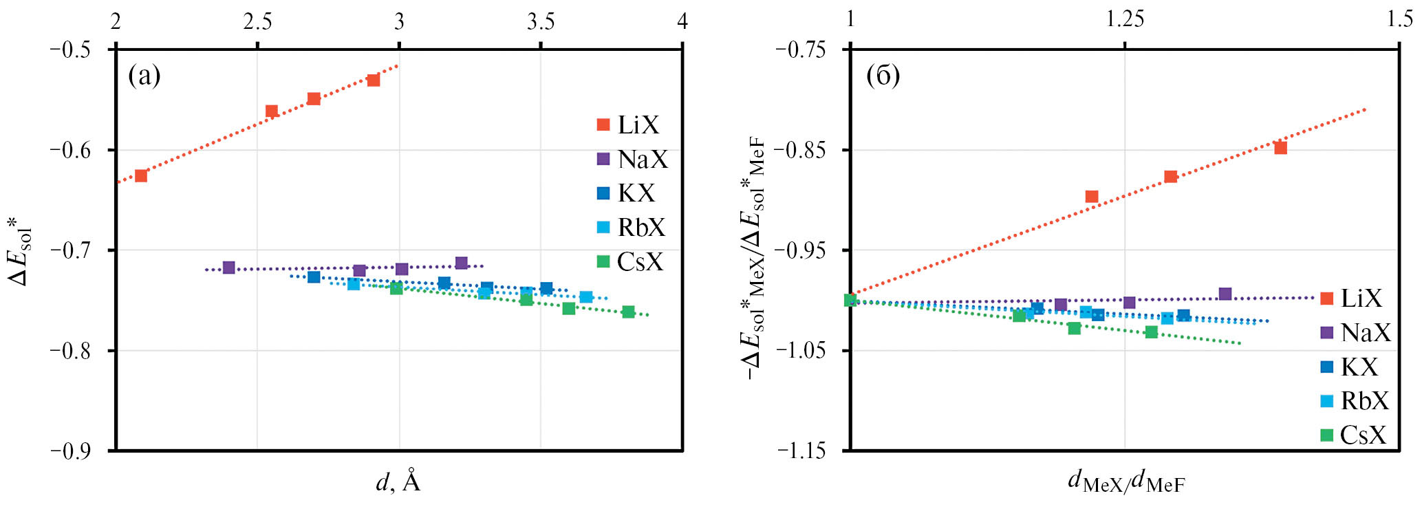 Рис. 6. Результаты расчетов приведенных внутренних энергий кристаллов галогенидов щелочных металлов ΔEsol*=ΔEsolε₀d/e² в зависимости от суммы радиусов катионов и анионов индивидуальных солей d (а); а также значения приведенных внутренних энергий кристаллов галогенидов лития, натрия, калия, рубидия и цезия, отнесенные к внутренним энергиям соответствующих фторидов щелочных металлов в зависимости от отношений суммы радиусов ионов каждой соли к сумме радиусов ионов аналогичных фторидных солей (б).