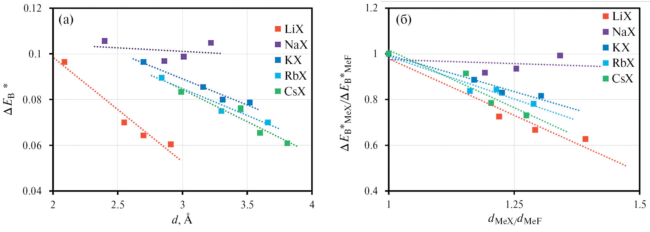 Рис. 8. Результаты расчетов отталкивательного вклада (Борна) в приведенную внутреннюю энергию кристаллов галогенидов щелочных металлов ΔEB*=ΔEBε₀d/e² в зависимости от суммы радиусов катионов и анионов индивидуальных солей d (а); а также значения этого вклада в приведенную внутреннюю энергию кристаллов галогенидов лития, натрия, калия, рубидия и цезия, отнесенные к борновскому вкладу во внутреннюю энергию соответствующих фторидов щелочных металлов в зависимости от отношений суммы радиусов ионов каждой соли к сумме радиусов ионов аналогичных фторидных солей (б).