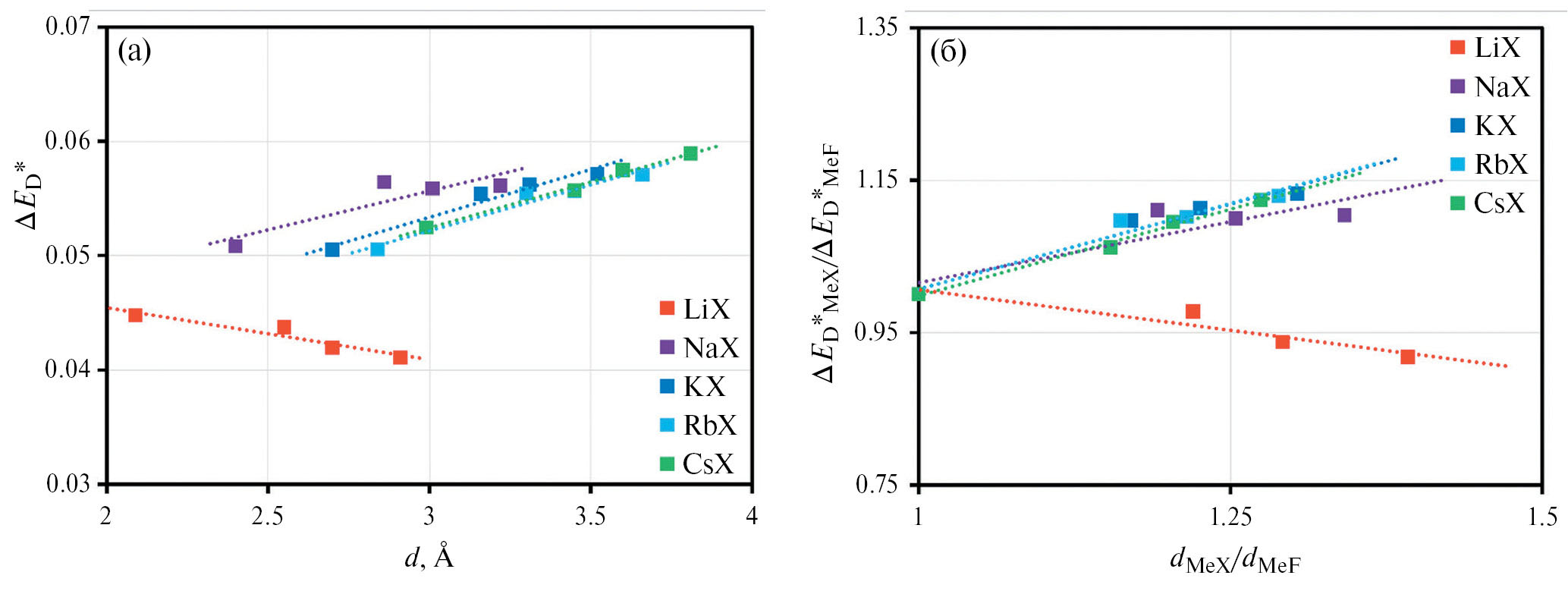 Рис. 9. Результаты расчетов колебательного вклада (Дебая) в приведенную внутреннюю энергию кристаллов галогенидов щелочных металлов ΔED*=ΔEDε₀d/e² в зависимости от суммы радиусов катионов и анионов индивидуальных солей d (а); а также значения этого вклада в приведенную внутреннюю энергию кристаллов галогенидов лития, натрия, калия, рубидия и цезия, отнесенные к дебаевскому вкладу во внутреннюю энергию соответствующих фторидов щелочных металлов в зависимости от отношений суммы радиусов ионов каждой соли к сумме радиусов ионов аналогичных фторидных солей (б).