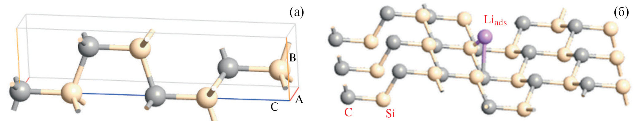 На рис. 1 приведены оптимизированные атомные структуры 2×2×1 суперъячеек гексагонального политипа 4H–SiC и 4H–SiC<Liads>.