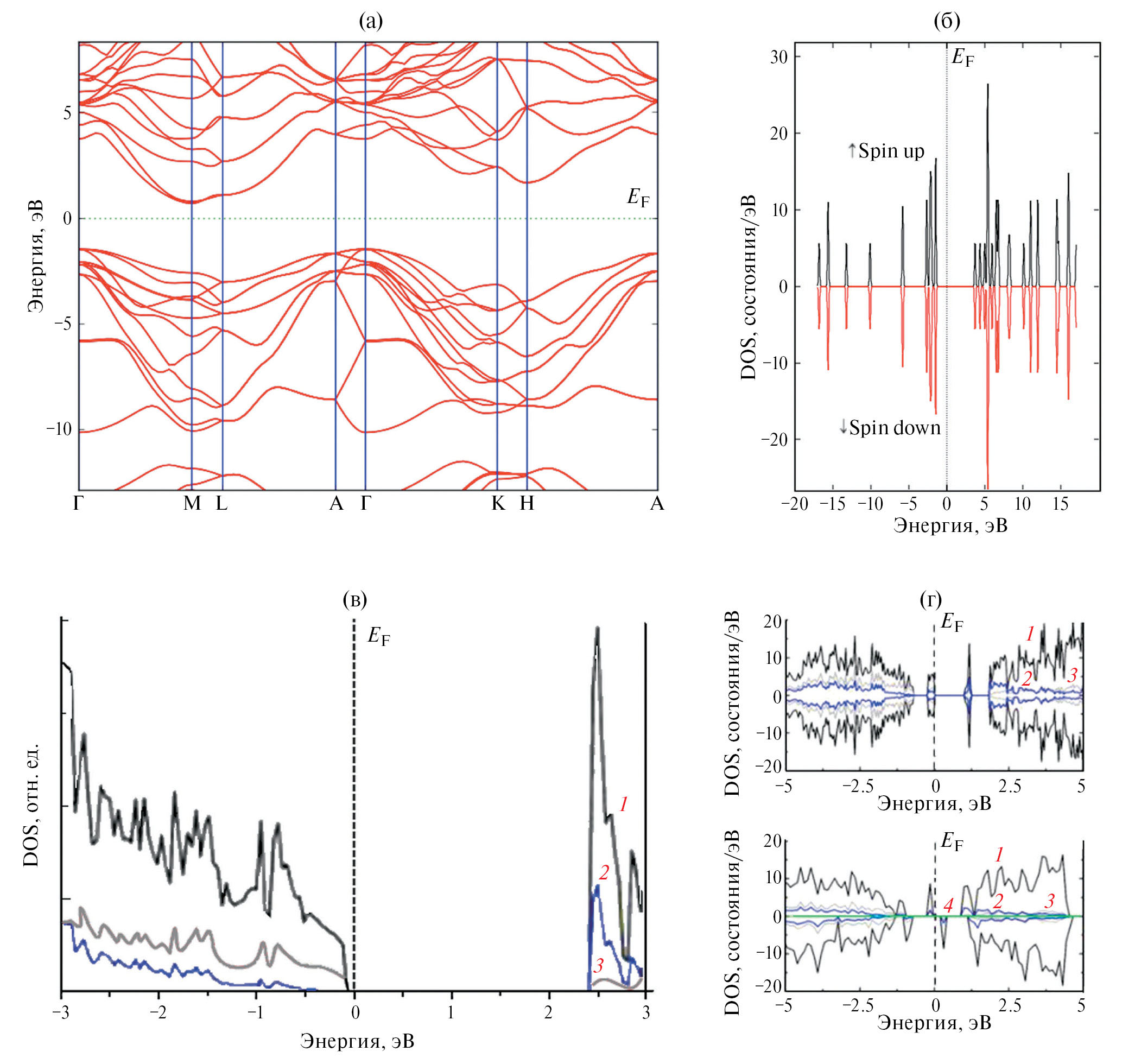 Рассчитанные DFT-GGA-PBE без учета эффекта спин-орбитальной связи, зонная структура и DOS суперъячеек на основе 4H–SiC показывают следующее. Из зонной структуры 4H–SiC<Liads> следует, что он, как и 4H–SiC, является полупроводником n-типа с непрямой шириной запрещенной зоны Eg = 2.16 эВ (рис. 2а). Здесь же (рис. 2б–г) приведены рассчитанные общая (б) и парциальная плотности состояний PDOS (в) 3×3×1 суперъячеек на основе 4H–SiC и для сравнения PDOS системы SW–SiC–Liads (г), содержащей дефект Стоуна–Уэльса (SW) [8].
