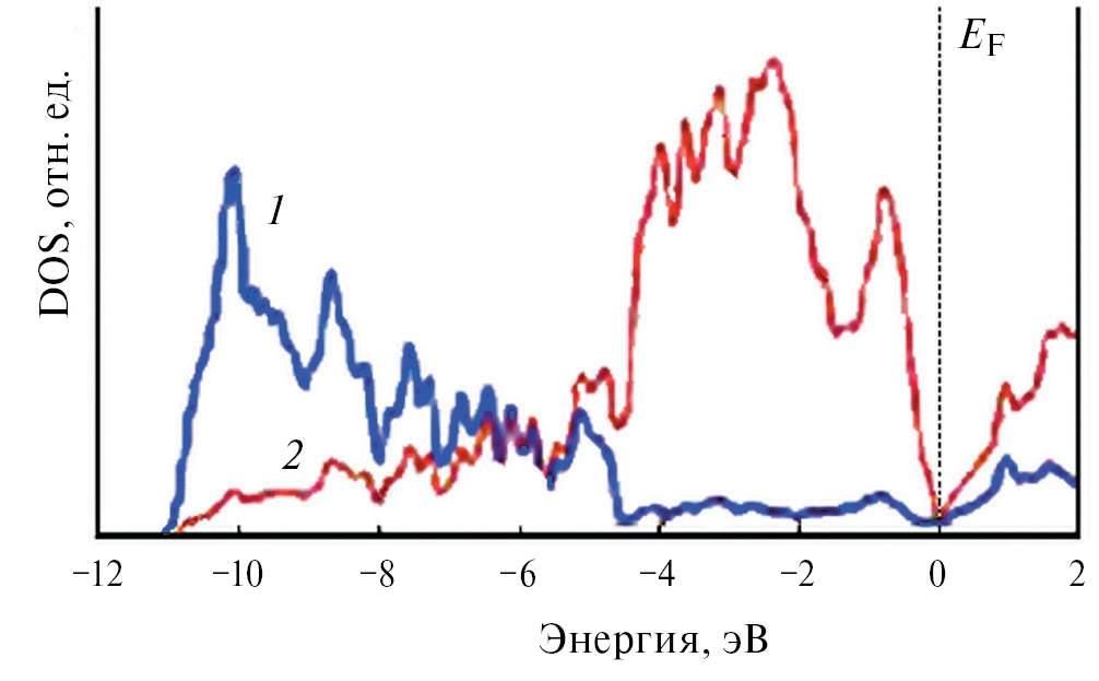 Рис. 4. Электронная плотность состояний DOS соединения LiSi. 1 – Si 3s-состояние, 2 – Si 3p-состояние. Уровень Ферми установлен на ноль эВ.