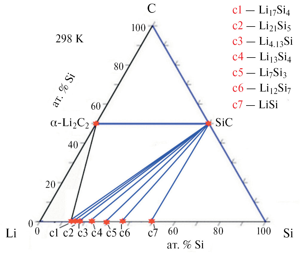 Материалы на основе бинарных соединений (AnBm = 4H–SiC, a – Li₂C₂, LinSim, где n и m – стехиометрические коэффициенты) тройной системы Si–C–Li представляют практический интерес, в частности, для перезаряжаемых Li-ионных батарей (LIB). Политипы полупроводникового SiC [1], а также полуметаллические соединения Li₂C₂ [2] и LinSim [3] являются ионными проводниками и ионообменниками. Соединения AnBm используются в качестве материалов электрода (анода) для LIB [4]. Однако, характеристики LIB сильно зависят от структуры, состава и свойств материалов электрода. Фазовые равновесия, термодинамические свойства и структура бинарных и некоторых тройных сплавов системы Si–C–Li изучены [5–8] недостаточно. Анализ известных работ по системе Si–C–Li показывает следующее.