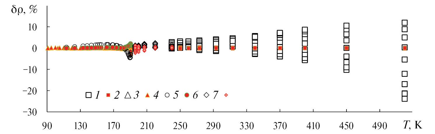 4. Fig. 3. Deviations, dr = 100(rexp – rcalc)/rexp, %, of the rcalc values ​​calculated using EFUS (32) and KUS [15, 84] from the experimental density values, rexp, [37, 40, 46, 51] (correspond to the density values, rcalc, calculated using EFUS and KUS: 1, 2 – [37]; 3, 4 – [46]; 5, 6 – [51]; 7, 8 – [40]): 2, 4, 6, 8 – EFUS (32); 1, 3, 5, 7 – KUS [15, 84].