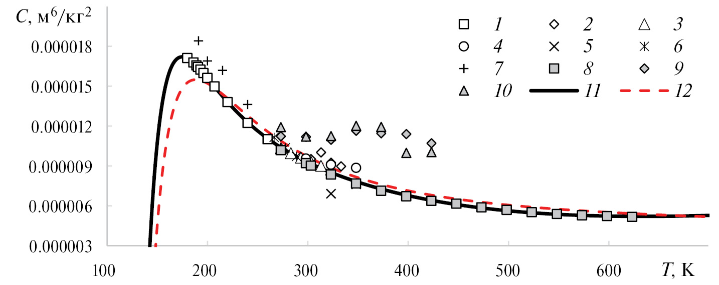 9. Fig. 8. Dependences of the third virial coefficient on temperature. Experimental data: 1 – [40], 2 – [43], 3 – [44], 4 – [50], 5 – [77], 6 – [53], 7 – [78], 8 – [54], 9 – [56], 10 – [57]. Calculated data: 11 – EFUS (32), 12 – [80].