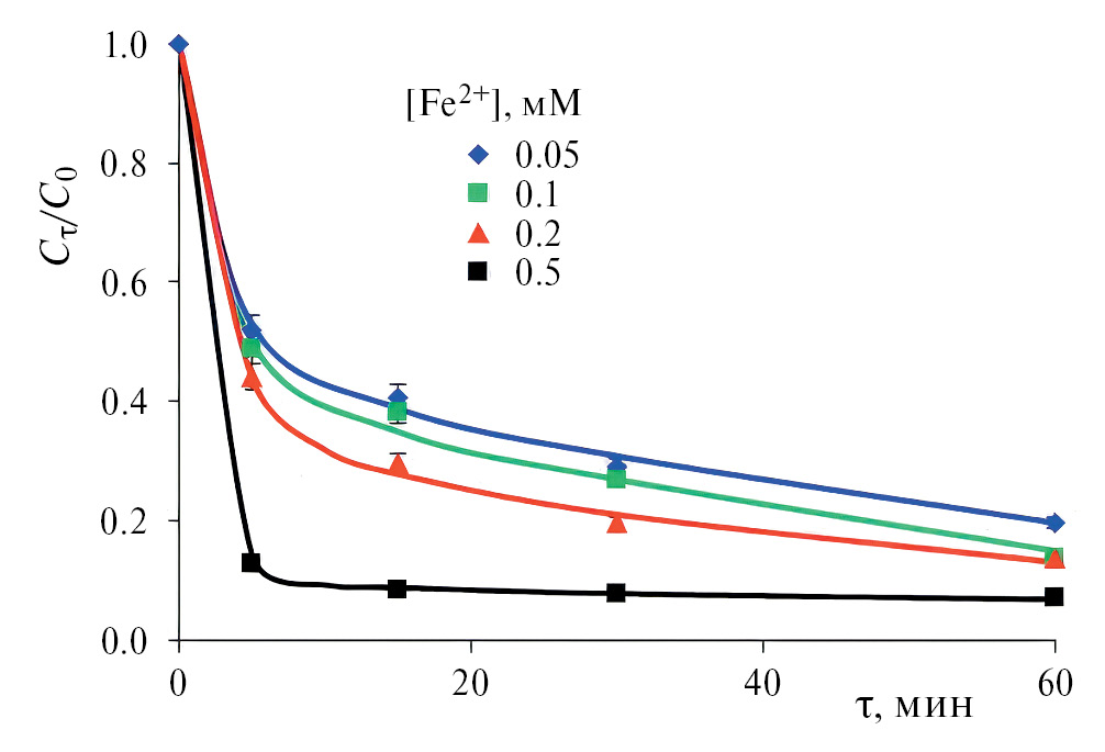 Существенное влияние на эффективность окисления органических соединений в фентон-подобной железо-персульфатной системе {Fe₂⁺/S₂O₈²⁻} оказывают концентрации Fe₂⁺и S₂O₈²⁻ и их соотношение. В ряде публикаций отмечалось, что максимальный выход активных форм кислорода (АФК) и оптимальные условия для окисления органических соединений реализуются при соотношении [S₂O₈²⁻]:[Fe₂⁺]=1:1 [24–27].