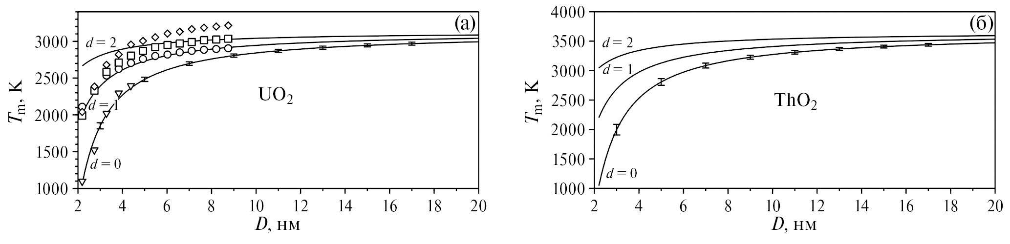 Рис. 1. Зависимости температуры плавления от характерного размера (D) нанообъектов, состоящих из UO₂ (а) и ThO₂ (б). Нанообъекты трех типов: наночастицы (d = 0), нанопроволоки (нановолокна) (d = 1), тонкие пленки (d = 2). Результаты расчетов методом молекулярной динамики: MOX-07 (▼), Goel-08 (♦), Yakub-09 (○) [11] и Б-М (■) [13].