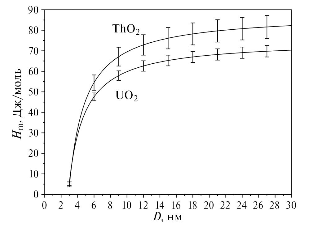 Большинство экспериментальных исследований и расчетов методами теории функционала плотности (ТФП) и молекулярной динамики (МД) посвящены структурным, электронным и оптическим свойствам нанооксидов актинидов (например, [4–7]). Тем не менее, плавление нанообъектов имеет большое фундаментальное и прикладное значение [8–10]. Поэтому для изучения плавления кубических наночастиц UO₂ в работах [11–13] было проведено несколько расчетов методом МД. Было показано, что температура плавления и энтальпия плавления снижаются с уменьшением характерного размера этих наночастиц. Плавление нанокристаллических ThO₂ и UO₂ с характерным размером кристаллитов (4 ± 1) нм и (30 ± 20) нм соответственн было исследовано в работах [14] и [15] экспериментально. Было обнаружено, что нанокристаллический ThO₂ плавится при температурах на 400…600 К ниже температуры плавления макроскопического ThO₂ [14]. Измеренная температура плавления нанокристаллического UO₂ была на 300 К меньше температуры плавления макроскопического UO₂. Было высказано предположение, что большая часть снижения температуры плавления наночастиц UO₂ обусловлена значительным увеличением молярного отношения кислорода к металлу [15], т. е. нестехиометрии образцов.