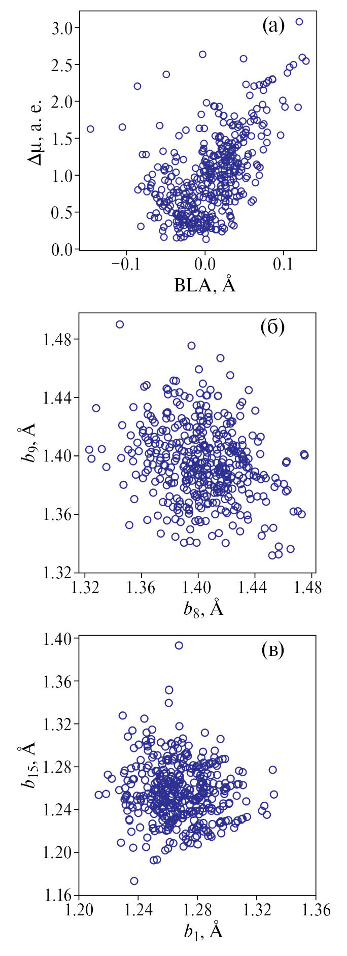 На рис. 3 представлены значения дескриптора BLA и изменения дипольного момента при возбуждении Dm, рассчитанные для 400 кадров из КМ/ММ МД траектории длиной 10 пс. В отличие от литературных данных, полученных для минимумов на поверхности потенциальной энергии, взаимосвязи BLA и Dm в молекулярно-динамической траектории не наблюдается (R2 = 0.28). По всей видимости, это связано с колебаниями длин связей, которое происходит в динамике.
