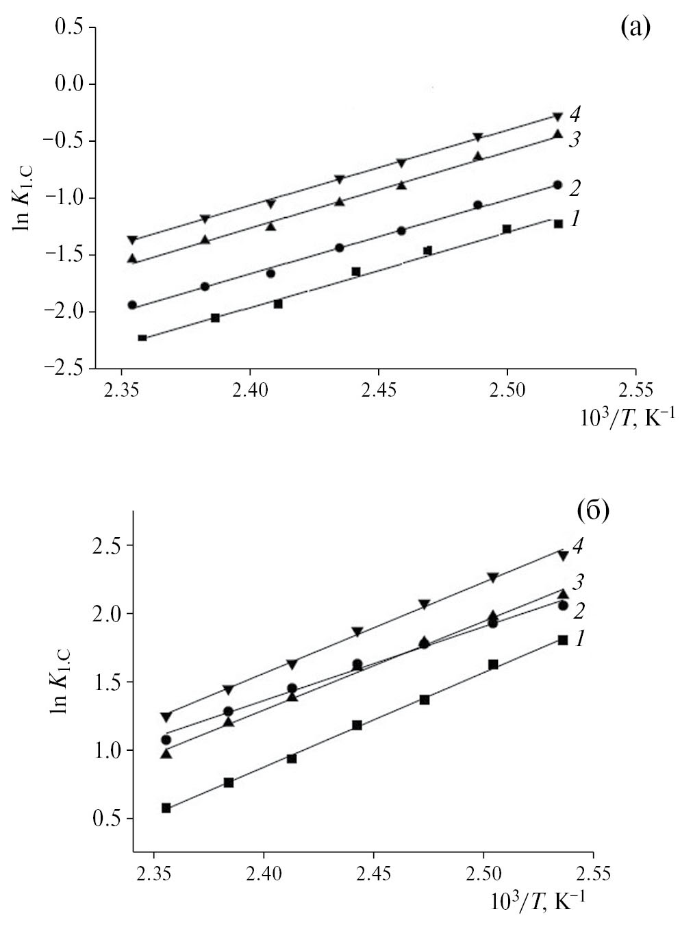 Рис. 7. Зависимости логарифма константы Генри адсорбции бензола (а) и нафталина (б) от обратной температуры на исходном Силипоре 200 (1) и модифицированном ацетилацетонатом никеля (2), бензоилацетонатом никеля (3), этилацетоацетатом никеля (4).