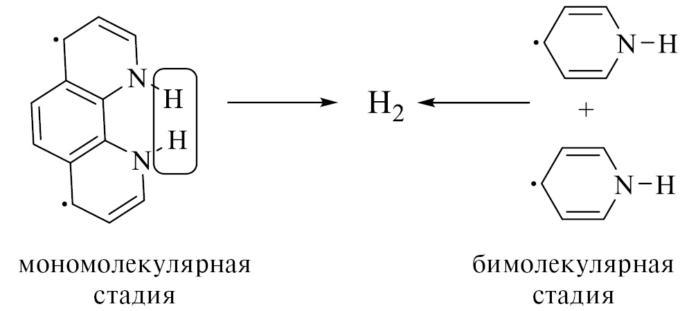 Следующей стадией является восстановление соединения IV с образованием соответствующего радикала (V), далее происходит протонирование второго атома азота с образованием катион-радикала VI с последующим его восстановлением и образованием соединения VII, в котором через стадию внутримолекулярного восстановительного элиминирования отщепляется водород и генерируется стартовое соединение I–III.