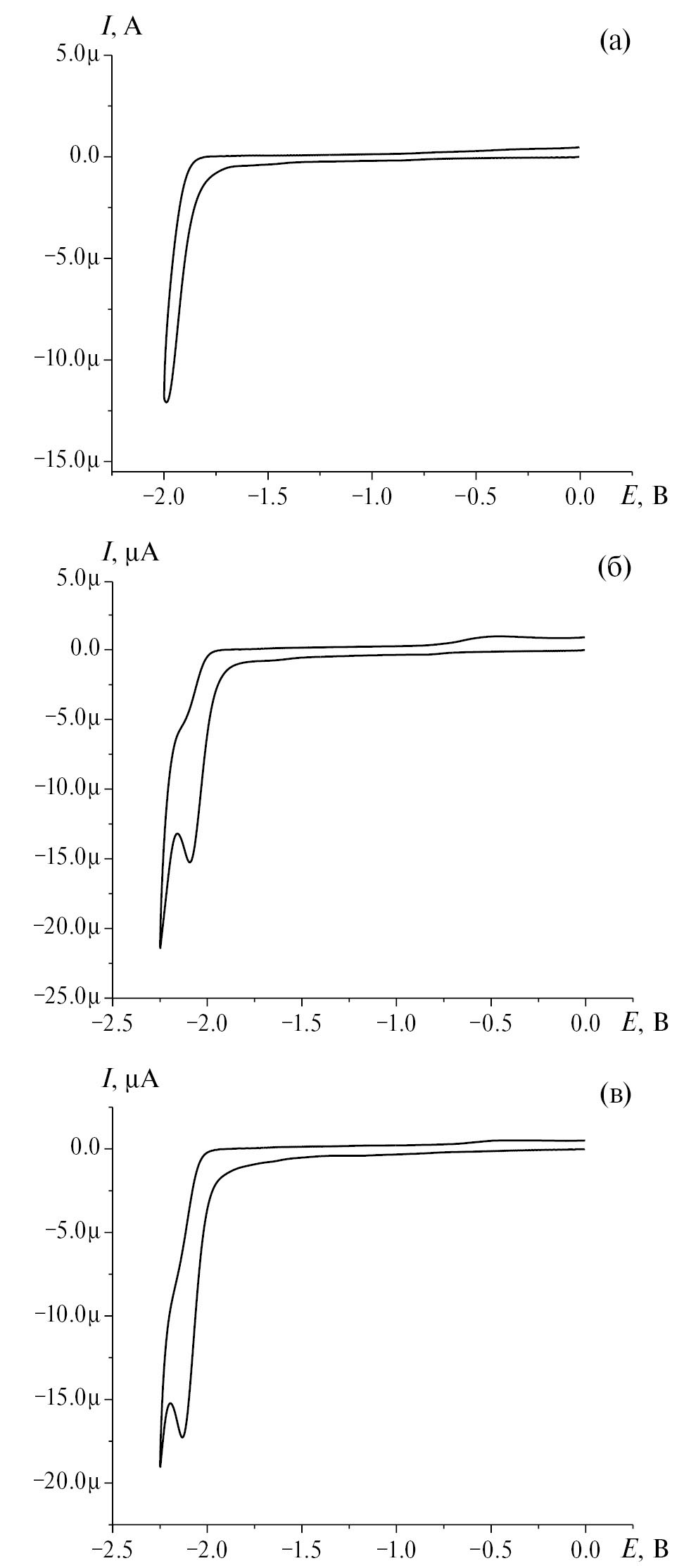 Электрохимические свойства соединений I–III были изучены с использованием метода циклической вольтамерометрии (рис. 1). Как видно на вольтамперограммах, во всех случаях, в катодной области наблюдается по одной одноэлектронной волне, потенциал которой зависит от количества заместителей в соединении. С увеличением количества метильных групп, потенциал восстановления смещается в катодную область. В анодной области электрохимическая активность соединений I–III не наблюдается.