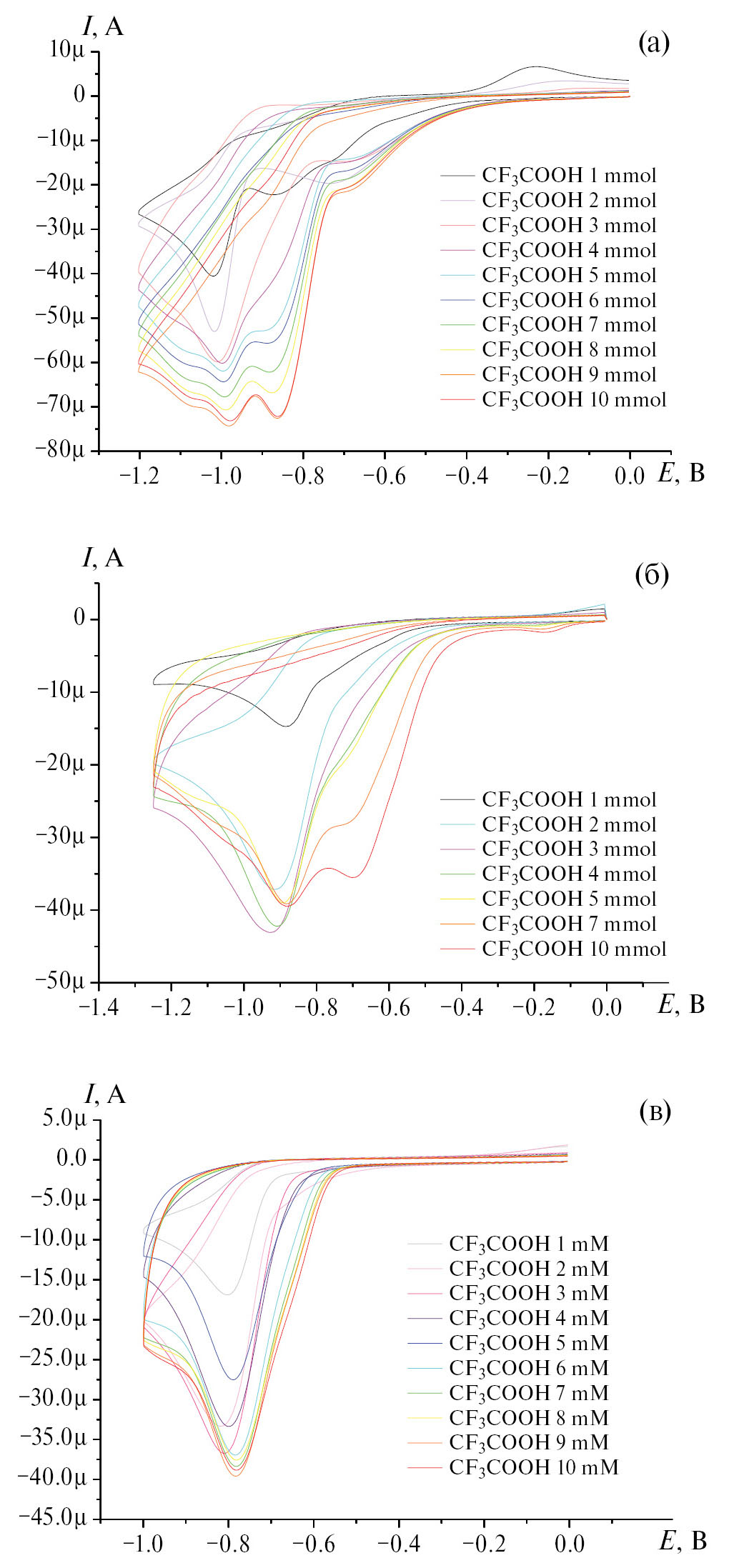 Можно предположить, что механизм протекающих реакций в случае соединений I–III, при данных потенциалах, схожий. Увеличение количества трифторуксусной кислоты приводит к увеличению тока электрокаталитического процесса, однако, в отличие от соединения I, в случае соединений II и III, наблюдается формирование второй электрокаталитической волны при потенциалах E = –0.65 (соединение II) и –0.85 В (соединение III).
