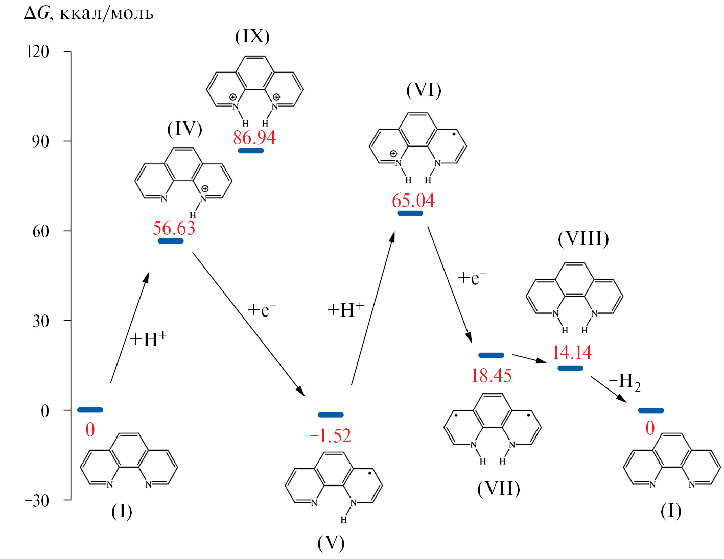 С целью подтверждения предположенного механизма реакции, а также нахождению энергетических характеристик электрокаталитического процесса были проведены квантово-химические расчеты с помощью метода DFT с использованием гибридного функционала B3LYP в базисе 6–31++G. На Схеме 4 приведена энергетическая диаграмма электрокаталитического механизма, показывающая термодинамическую возможность образования молекулярного водорода на примере соединения I. Представленные на Схеме 3 относительные значения свободной энергии Гиббса для соединений IV–IX получены путем нормировки относительно свободной энергии Гиббса соединения I.