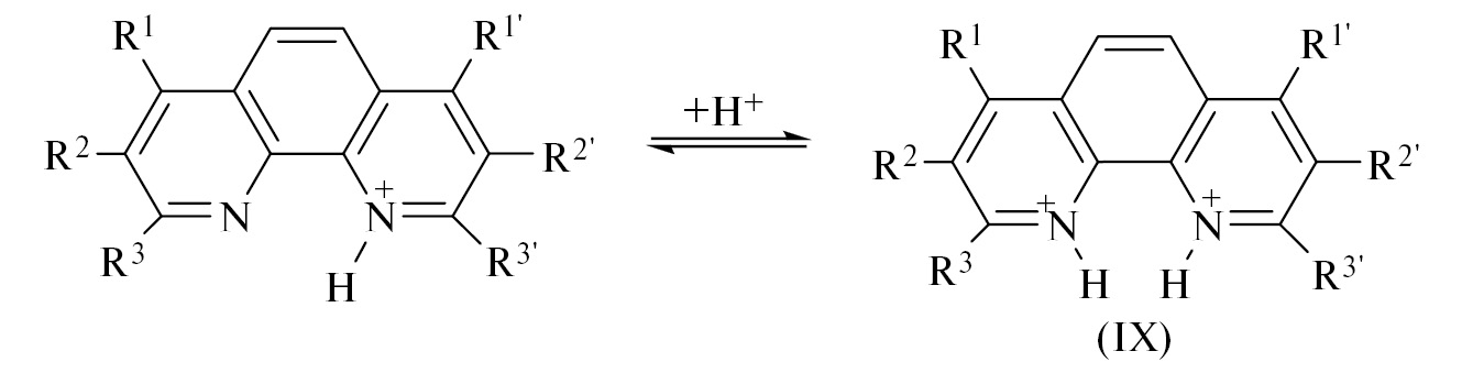 Как следует из рис. 2б и в, появление каталитических волн при потенциалах E = –0.65 (соединение II) и –0.85 В (соединение III) связано с природой катализатора, а именно с количеством метильных заместителей в гетероциклическом остове. Можно предположить, что формирование данных волн связано с образованием дикатионов соединений II и III. Поскольку увеличение метильных заместителей приводит к тому, что основность атомов азота в гидропроизводном возрастает относительно соединения I, что и приводит к образованию дипротонированых соединений, которые далее вовлекаются в электрокаталитический процесс [26]. В случае соединения I протонирование по обоим атомам азота с образованием дикатиона (соединение VIII) не протекает (Схема 5).
