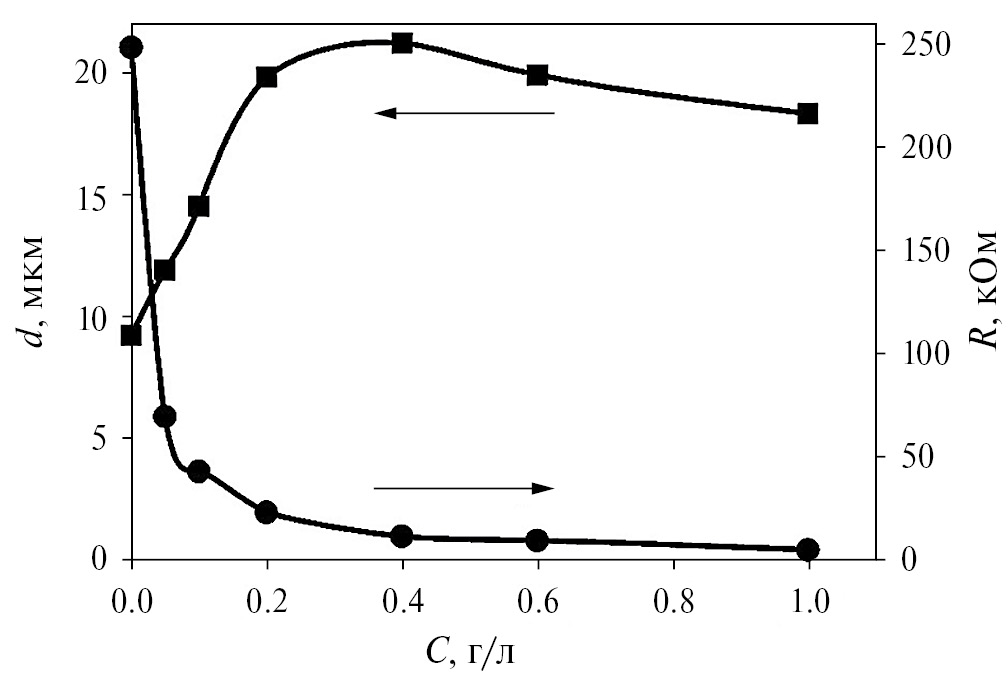 Изменение толщины покрытий SDC было исследовано на модельном электроде Ni-фольга при ЭФО из суспензий 10 г/л SDC в среде iPrOH/HAcAc (90/10 об. %) с различной концентрацией йода до 1 г/л. ЭФО проводили в режиме постоянного напряжения 80 В в течение 1 мин. Было установлено, что при всех значениях концентрации йода покрытие SDC было сплошным, зависимости толщины покрытия и сопротивления суспензии SDC от концентрации йода представлены на рис. 4.