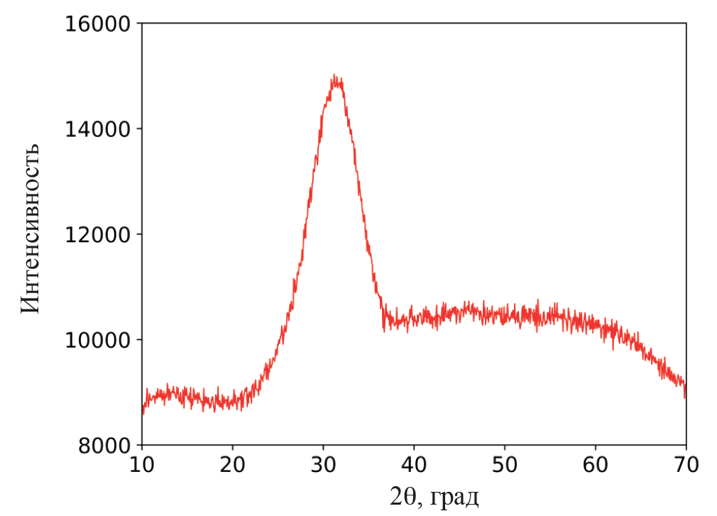 Синтез стекла. Синтез стекла в системе CaO–Al2O3–SiO2 проводили методом закалки. Сначала прекурсоры (CaCO3, α-Al2O3 и SiO2) высушивали от сорбционной воды в течение 12 ч в муфельной печи в атмосфере воздуха при 300°C, 1000°C и 500°C соответственно. Затем рассчитанные количества исходных порошков перемешивали в миксере (синтез проводился из расчета на 10 г продукта). Получившуюся смесь помещали в Pt/Au тигель и прокаливали в течение 1 часа в муфельной печи при 1000°C для удаления CO2, после чего температуру повышали до 1600°C (выше температуры ликвидуса) для полного расплавления смеси и выдерживали образец в таких условиях в течение 2 ч. Тигель извлекали из печки щипцами с платиновым наконечником и быстро опускали дно тигля в холодную воду для закалки стекла, причем таким образом, чтобы внутрь тигля вода не попадала. Образец застекловывался в течение ~10–20 с. Получившееся стекло доставали из тигля и перетирали в порошок в автоматической агатовой ступке. Затем снова помещали размолотое стекло в тигель и выдерживали в печи при 1600°C около 2 ч. Такую последовательность действий повторяли 3 раза для получения максимально гомогенизированного образца. Для подтверждения того, что синтезированный образец не содержит каких-либо кристаллических фаз, проводили порошковый рентгенофазовый анализ (РФА); результат показан на рис. 1. Как видно из представленных данных, на рентгенограмме отсутствуют узкие интенсивные пики, характерные для кристаллических фаз, что, в пределах чувствительности метода, подтверждает аморфность полученного образца.