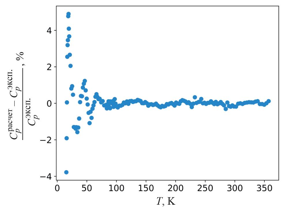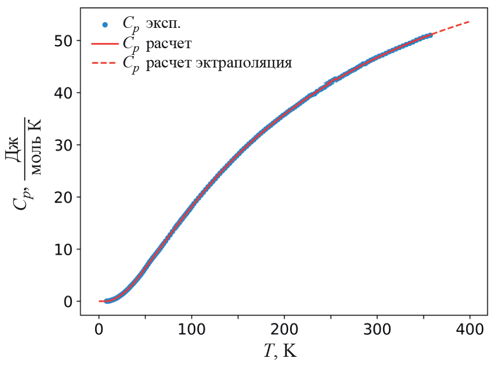 Калибровку калориметра осуществляли посредством измерения теплоемкости пустой калориметрической ампулы (Ck0). Проверку надежности работы калориметра проводили в ходе измерения теплоемкости стандартных эталонных образцов (бензойной кислоты, корунда, меди особой чистоты). Отклонения полученных значений Cp,m от паспортных данных составили ± (1.5–2)% в интервале 5–17 K, ± 0.5% в области 17–40 K и ± (0.2–0.3)% в области температур > 40 K.