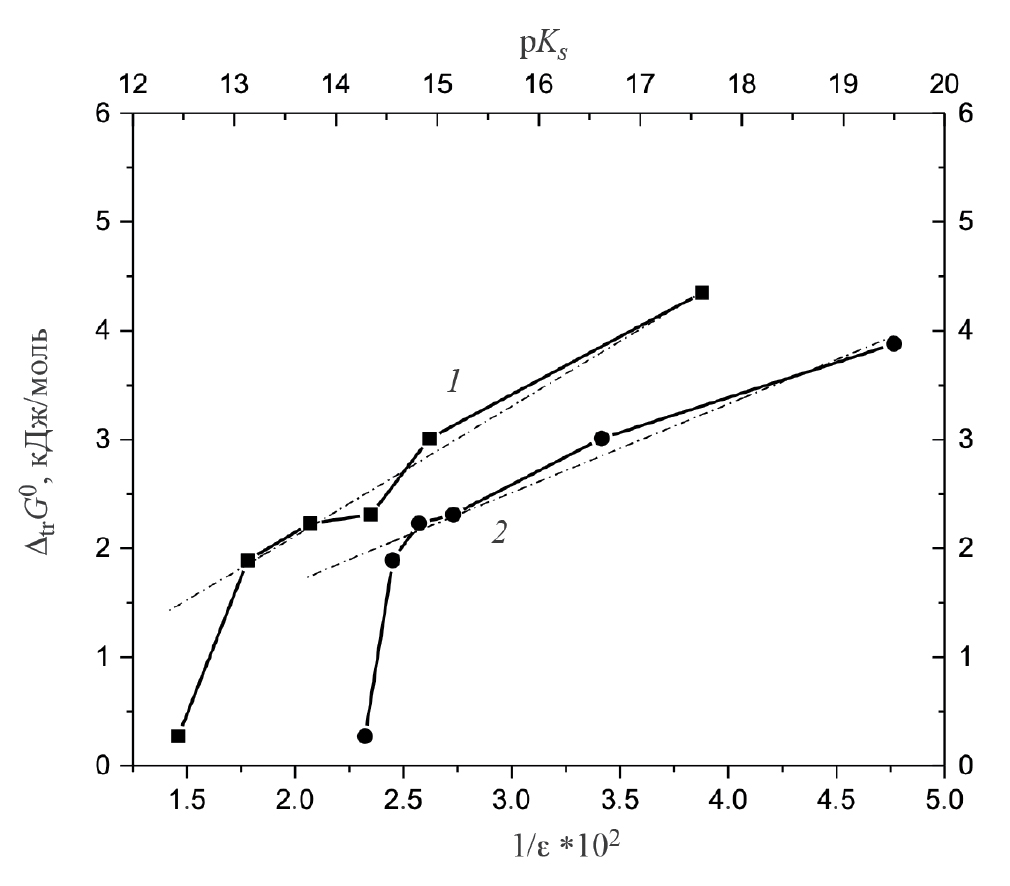 Сольватирующую способность растворителя определяют его физико-химические свойства, такие как диэлектрическая проницаемость, склонность к автопротолизу, полярность, донорно-акцепторные числа и др. [11, 25–29]. Энергия Гиббса переноса криптанда[2.2.2] из воды в водно-этанольные смеси, в частности, хорошо коррелирует с изменением константы автопротолиза (pKs) [30] и диэлектрической проницаемостью (ε) [30] водно-этанольного растворителя (рис. 1). Отклонение от корреляционных зависимостей (линеаризованные зависимости ΔtrG°(Cryp) = f (1 / ε) и ΔtrG°(Cryp) = f (pKs) показаны штрихпунктирной линией) наблюдается только для величины энергии Гиббса переноса криптанда из воды в водно-этанольную смесь состава 0.1 мол. доли EtOH, но это отклонение не превышает заявленную погрешность определения ΔtrG°(Cryp).