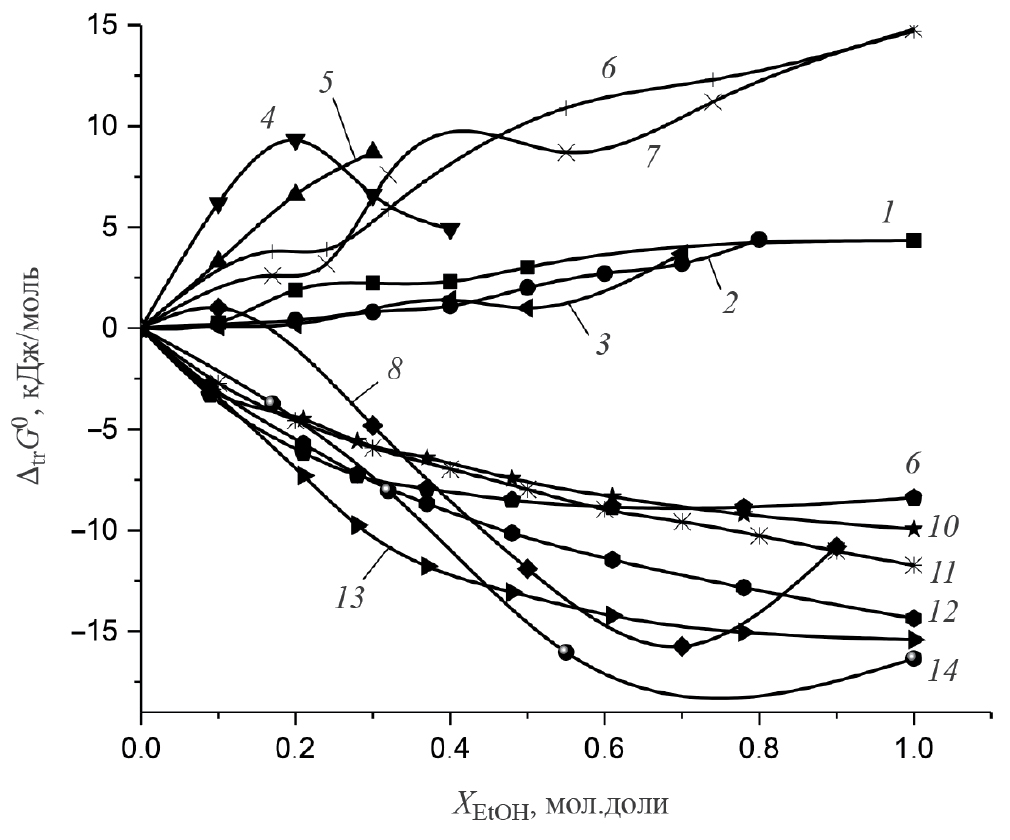 Рис. 2. Энергия Гиббса переноса из воды в водно-этанольный растворитель: 1 – криптанда[2.2.2], 2 – аммиака [48], 3 – 18-краун-6 эфира [49], 4 – уксусной кислоты [47], 5 – глицилглицина [46], 6 – α-аланина [42], 7 – глицина [42], 8 – никотинамида [36], 9 – ацетаминофена [38], 10 – ванилина [39], 11 – п-нитроанилина [35], 12 – бензойной кислоты [40], 13 – салициловой кислоты [41], 14 – 2-амино-4,5-диметилтиофен-3-карбоксамида [37].