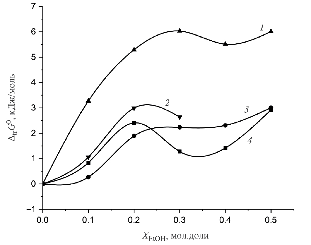 Полученные значения энергии Гиббса переноса криптанда[2.2.2] из воды в смеси вода–этанол принимали за стандартные значения, что связано с использованием низких концентраций криптанда[2.2.2] в растворах.