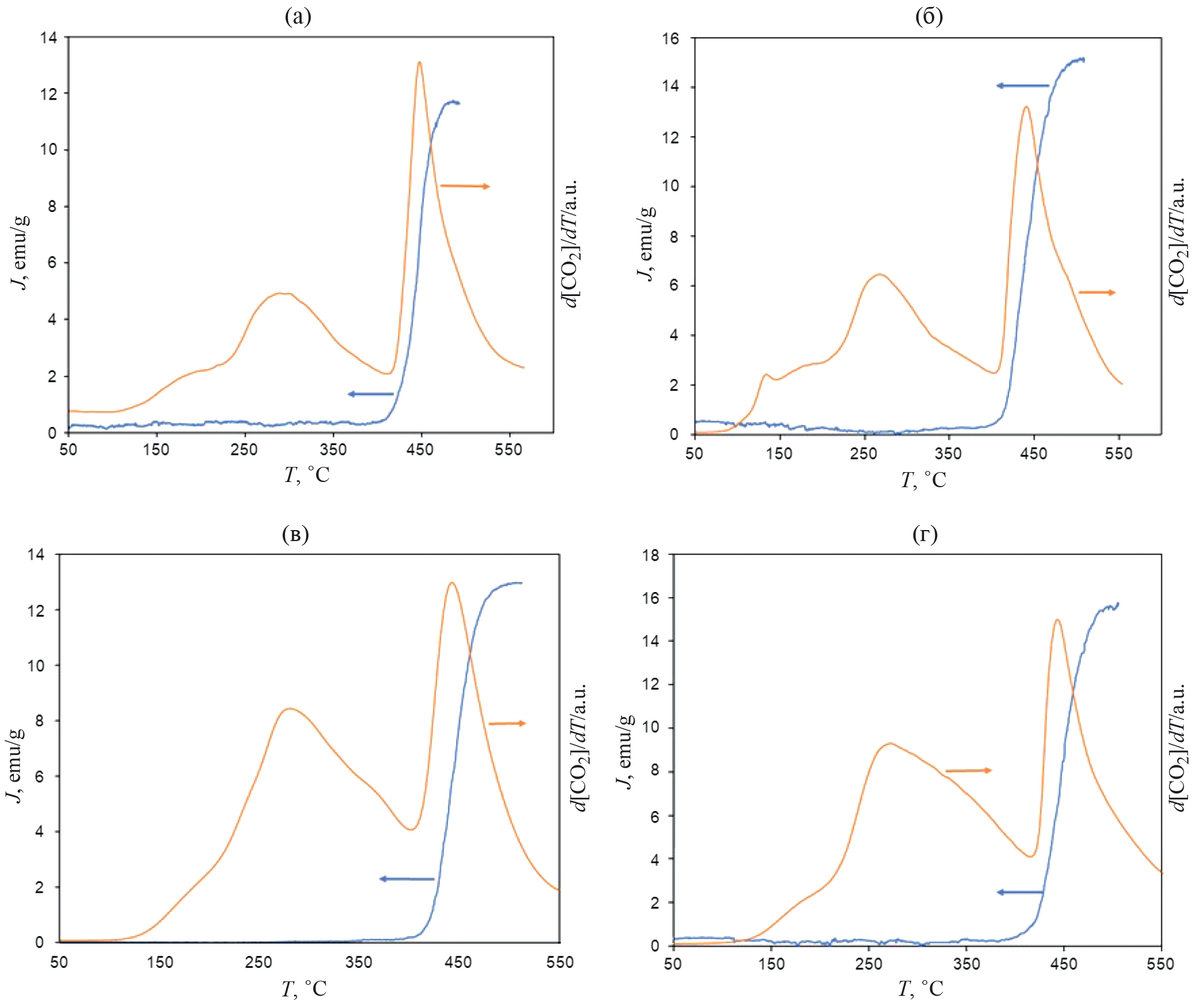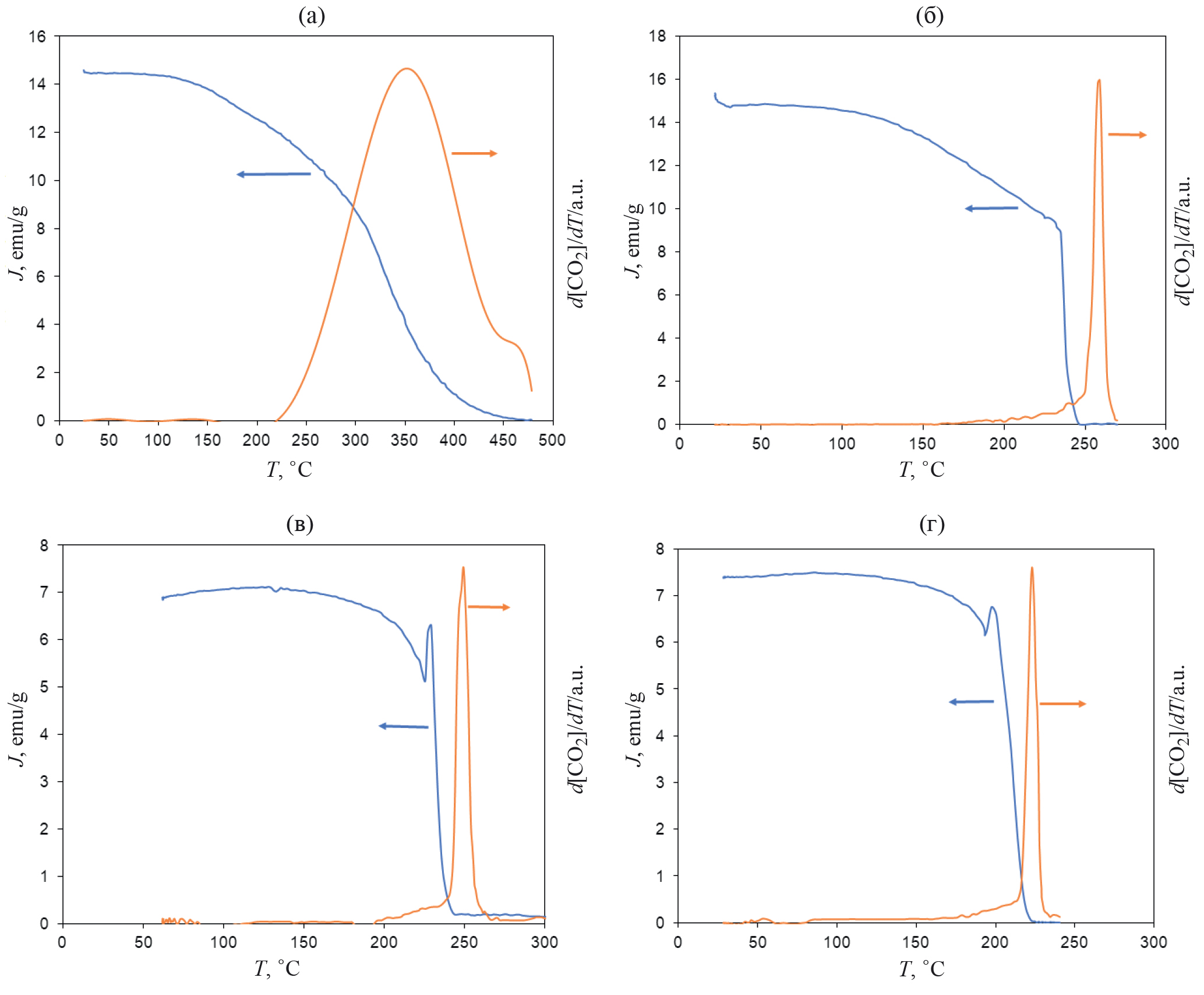 Рис. 1. Намагниченность и скорость выделения CO2 при температурно-программированном нагреве в токе аргона образцов Co-1Glu (а), Co-3Glu (б), Co-5Glu (в) и Co-7Glu (г).