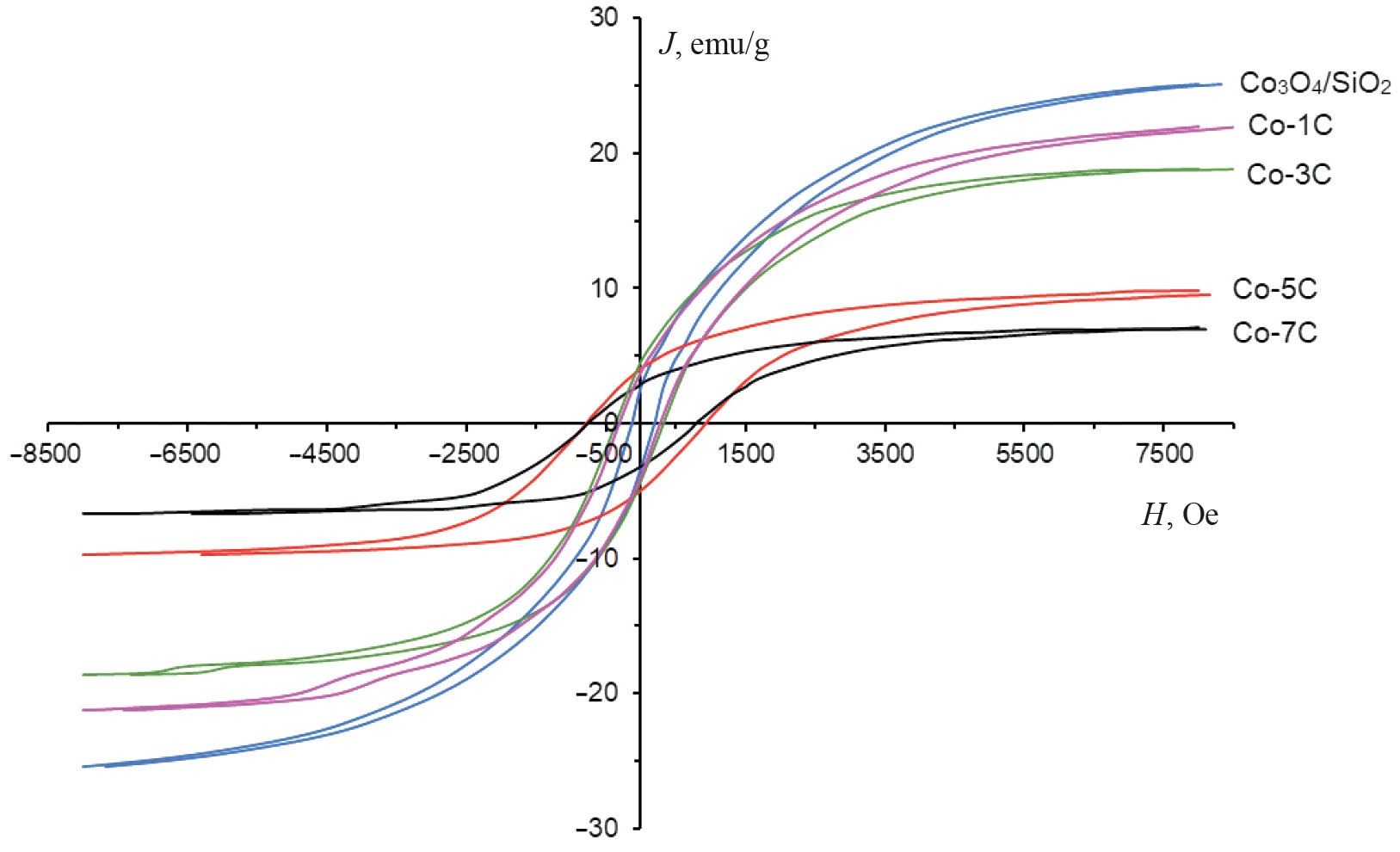 В табл. 2 приведены магнитные характеристики образцов – намагниченность насыщения, остаточная намагниченность и коэрцитивная сила – после температурно-программированного нагрева в потоке аргона. Приготовленные таким образом образцы выдерживали в течение 5 суток в атмосфере воздуха в эксикаторе над хлоридом кальция при комнатной температуре после чего повторяли магнитные измерения. Намагниченность насыщения для менее карбонизированных образцов Co-1C и Co-3C оставалась неизменной в пределах экспериментальной погрешности. Напротив, более карбонизированные образцы Co-5C и Co-7C демонстрировали значительное падение намагниченности после стояния на воздухе. Это свидетельствует о постепенном окислении металлического кобальта в этих образцах по мере нахождения на воздухе. Также для Co-5C и Co-7C было обнаружено многократное увеличение коэрцитивной силы (табл. 2, рис. 2).