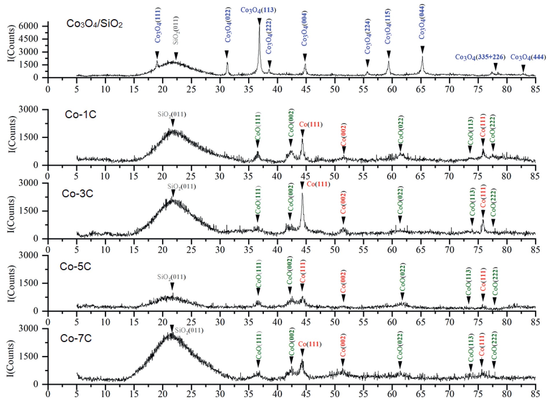 Рис. 3. Дифрактограммы образцов Co3O4/SiO2 и Co-1C–Co-7C.
