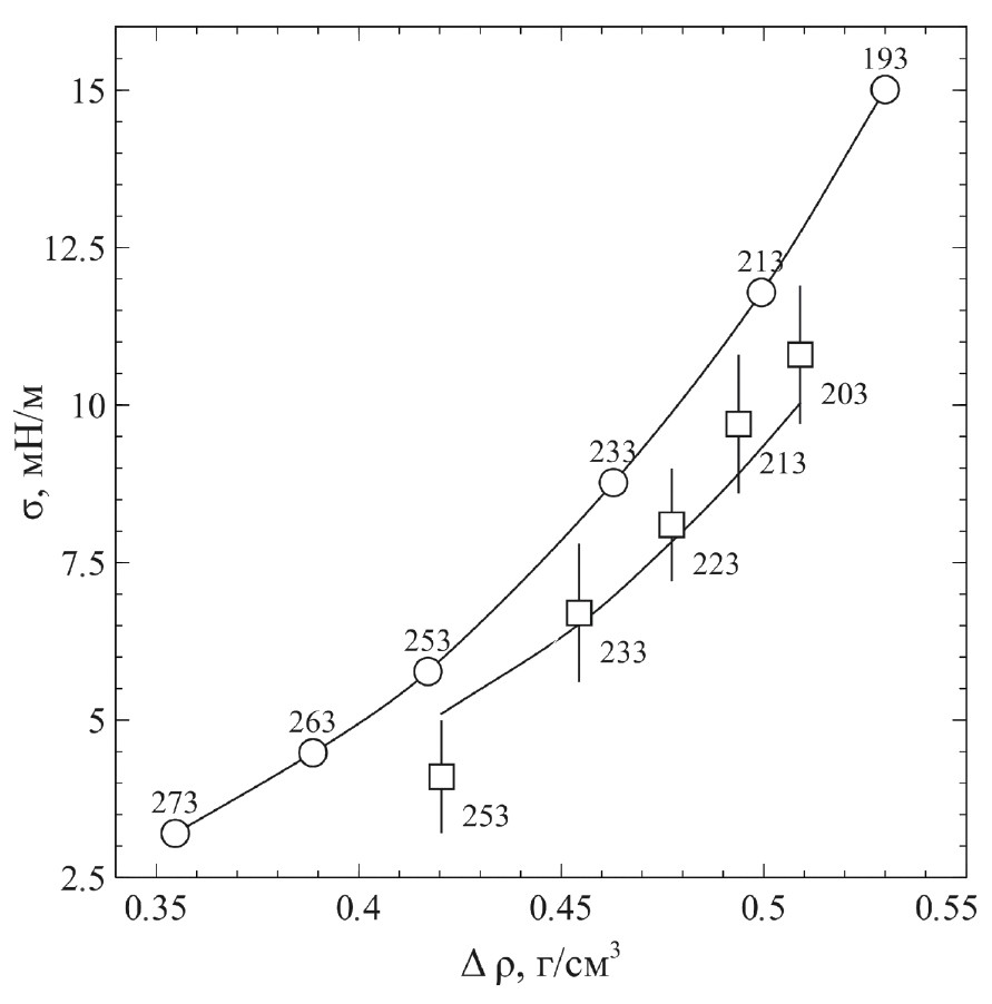 Рис. 1. Зависимости поверхностного натяжения от разности плотностей этана в жидкой и газовой фазах, полученные с помощью МД-моделирования чистого этана (квадраты) и в эксперименте [2] (круги). Цифры показывают температуру в К, при которой получена соответствующая точка.