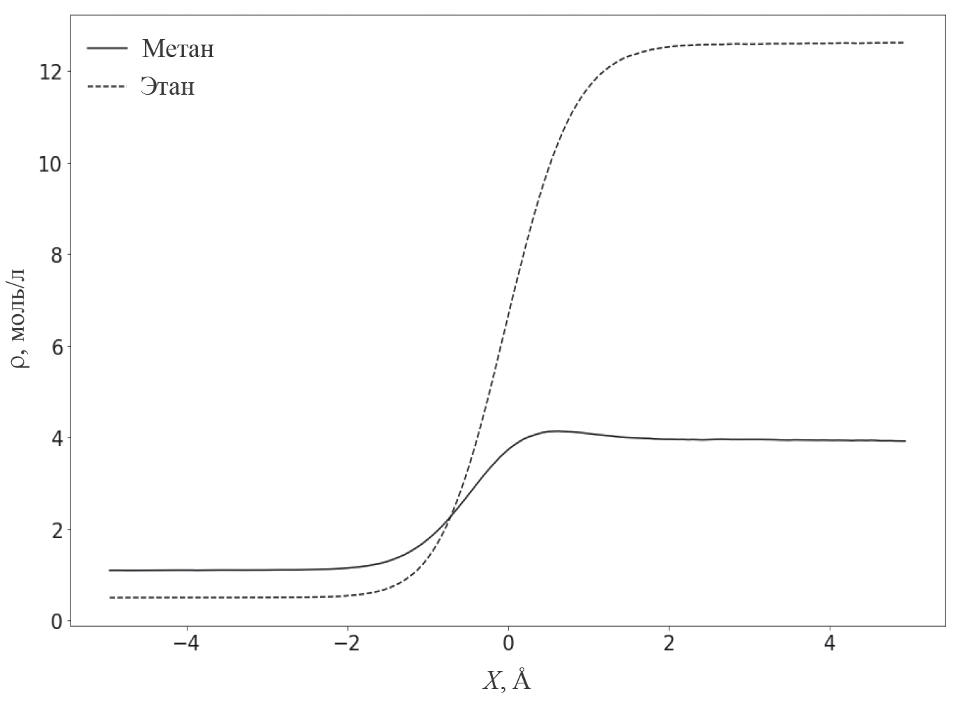 На профиле плотности метана близко к межфазной границе можно заметить максимум. Значение в нем превышает плотность как в объеме пара, так и в объеме жидкости, что говорит об избыточной адсорбции метана на межфазной границе.