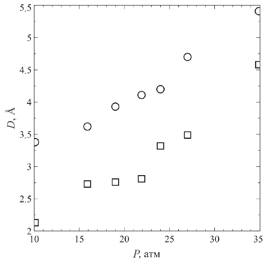 Через аппроксимацию профиля плотности можно получить толщину межфазной границы, это параметр D в уравнении (7). Поскольку аппроксимации для профилей плотности метана и этана проводятся независимо, получается два значения толщины межфазной границы. Так как на значение для метана влияет пик адсорбции, более релевантной является толщина межфазной поверхности, полученная для этана. Невозможно определить, является ли разница между этими значениями постоянной, но можно увидеть, что они ведут себя сходным образом (рис. 4). Чем выше давление в системе, тем шире слой между жидкой и газовой фазой, поскольку уменьшается разность плотностей и составов фаз. Увеличение толщины межфазной границы с увеличением давления было получено и для решеточного газа [6].