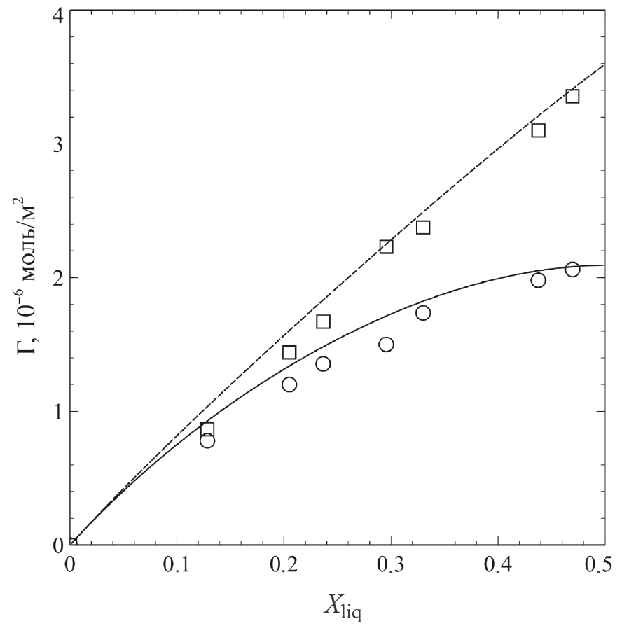 Для аппроксимации и проверки термодинамической согласованности полученных результатов можно воспользоваться тремя уравнениями. Рассмотрим поверхность раздела Гиббса, определяемую линейным соотношением между поверхностными избытками двух компонентов: