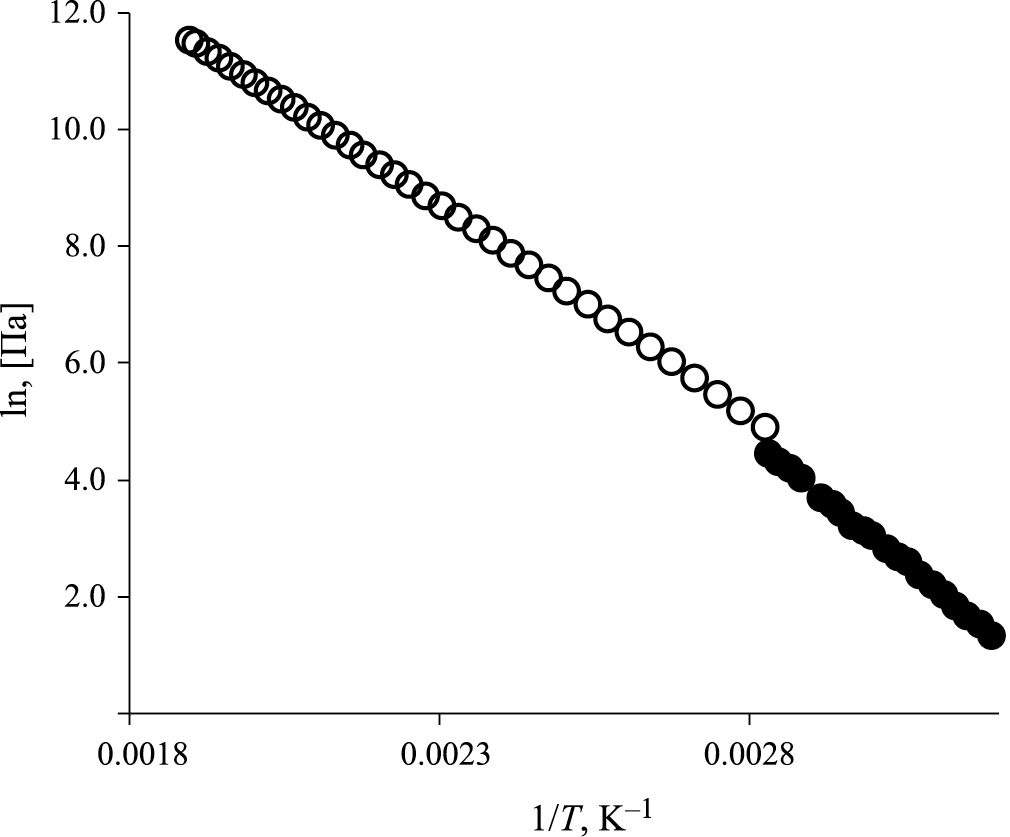 Полученные значения давлений насыщенных паров, значения DvapHo (298.15 K) и значения изменения теплоемкости перехода “газ-жидкость” () представлены в табл. 2, а на рис. 2 и 3 представлены зависимости логарифмов давлений насыщенных паров (полученных в данной работе и литературных данных [21]) от обратной температуры для диметил- и диэтилмалатов.