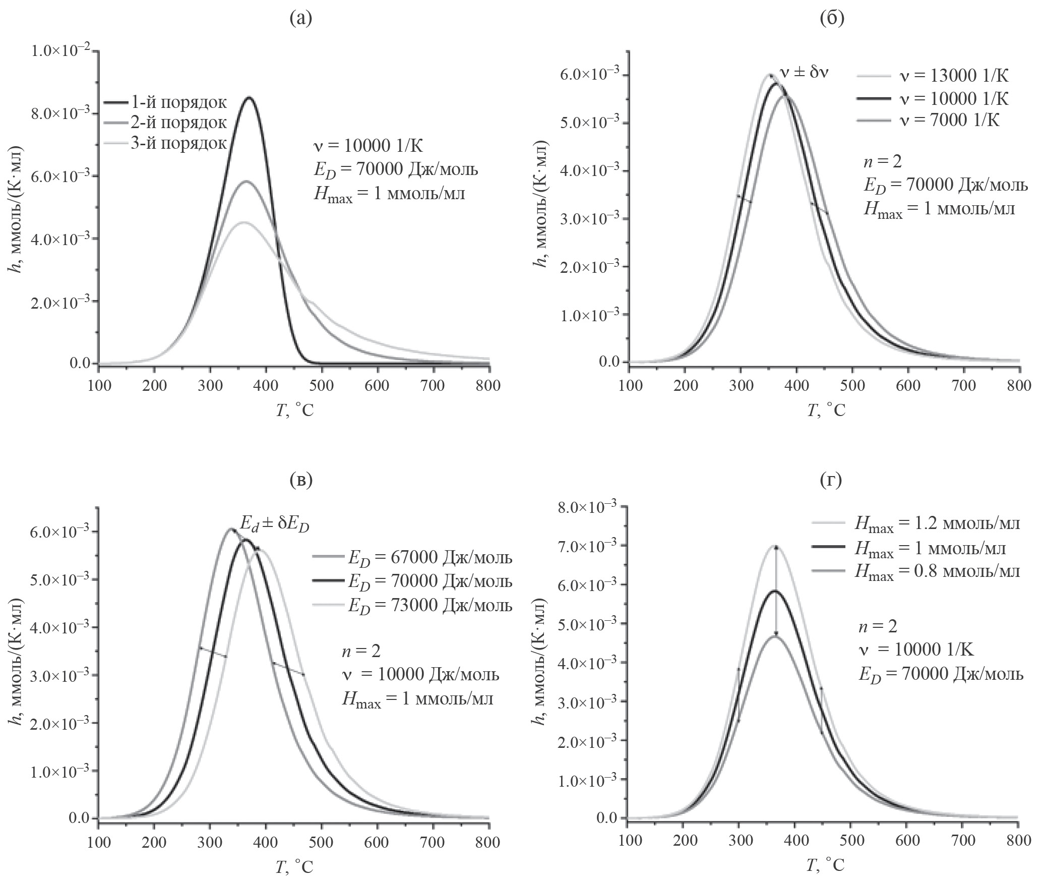 В первую очередь стоит выделить влияние наблюдаемого порядка реакции (рис. 4а). Видно, что изменение порядка реакции влияет на соотношение левой (растущей) и правой (нисходящей) ветвей пиков десорбции (кривых слева и справа от максимума). Для первого порядка левая ветвь более пологая, чем правая, которая имеет резкое падение после достижения максимальной скорости выделения аммиака. Кроме того, при одних и тех же значениях других параметров для первого порядка характерно более высокое значение максимума дифференциальной кислотности.