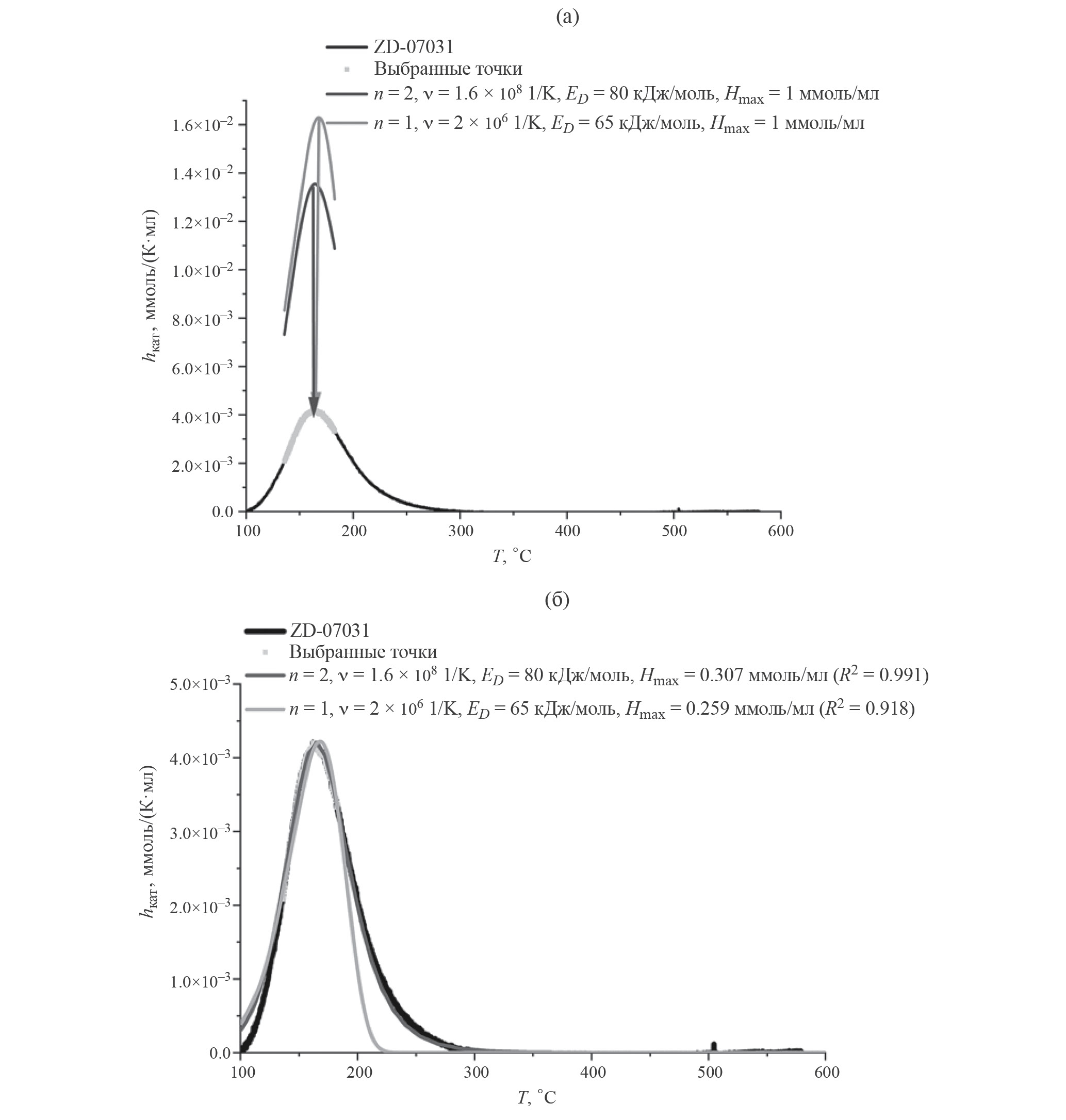 где hi – дифференциальная кислотность i-го центра, равная скорости выделения аммиака с поверхности катализатора, Hi – интегральная кислотность, равная остаточной концентрации аммиака на поверхности катализатора, Hmax,i – общая кислотность i-х центров адсорбции аммиака, равная их начальной концентрации перед десорбцией, hкат – скорость выделения аммиака со всех центров в данный момент времени и при данной температуре – именно эта величина чаще всего и представляется в виде результата ТПД NH3, Hкат – общее значение кислотности, представляющее собой концентрацию всех центров адсорбции на исследуемом катализаторе, k0,i – Аррениусовский предэкспоненциальный множитель, размерность которого зависит от наблюдаемого порядка реакции. Кинетическая модель, состоящая из уравнений (4)–(6) и предложенная в работе [19], описывает процесс десорбции, однако следует учитывать, что реакции десорбции должны быть простыми и иметь активационный барьер, то есть, в отличие от модели в работе [19], в которой считалось, что порядки n = 0, 1, 2. В предлагаемой нами модели порядки должны быть только целочисленными и в следующем диапазоне значений n = 1, 2, 3, что соотносится с критериями, представленными в работах С. Вязовкина [28]. При этом роль соседних адсорбированных молекул аммиака в такой модели протекания десорбции можно связать с восполнением недостатка энергии, затрачиваемой на преодоление активационного барьера процесса.