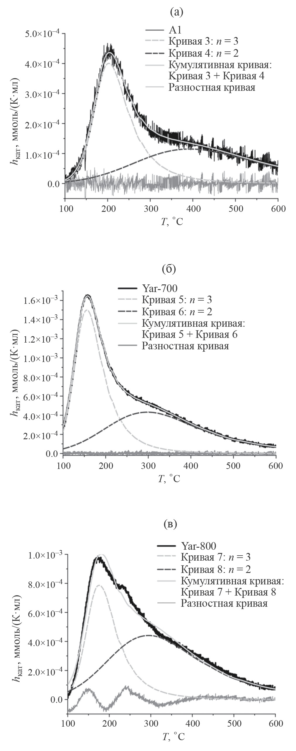Рис. 9. Кривые ТПД аммиака образцов A1 (а), Yar-700 (б) and Yar-800 (в) с деконволюцией посредством предложенной кинетической модели.