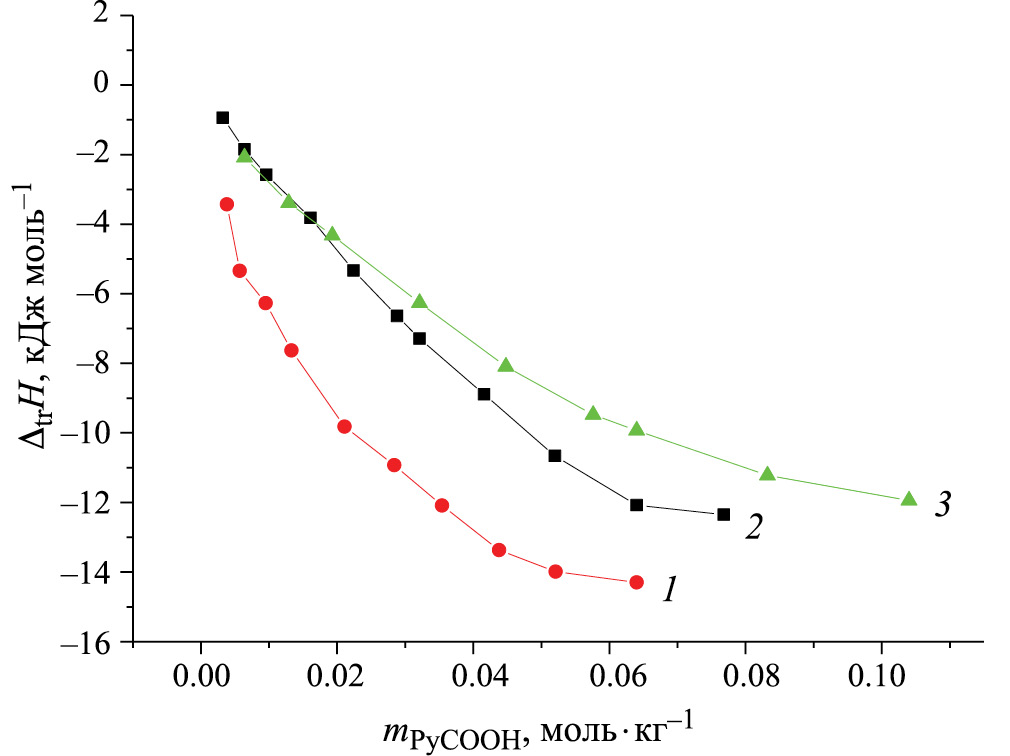 Экспериментальные значения энтальпии растворения гистидина в буферных растворах, содержащих изоникотиновую и пиколиновую кислоты переменной концентрации, представлены в табл. 1; там же для сравнения приведены данные для никотиновой кислоты, полученные нами ранее [25]. Как видно из табл. 1, эндотермичность процесса растворения аминокислоты уменьшается с ростом концентрации пиридинмонокарбоновой кислоты в буферном растворе.