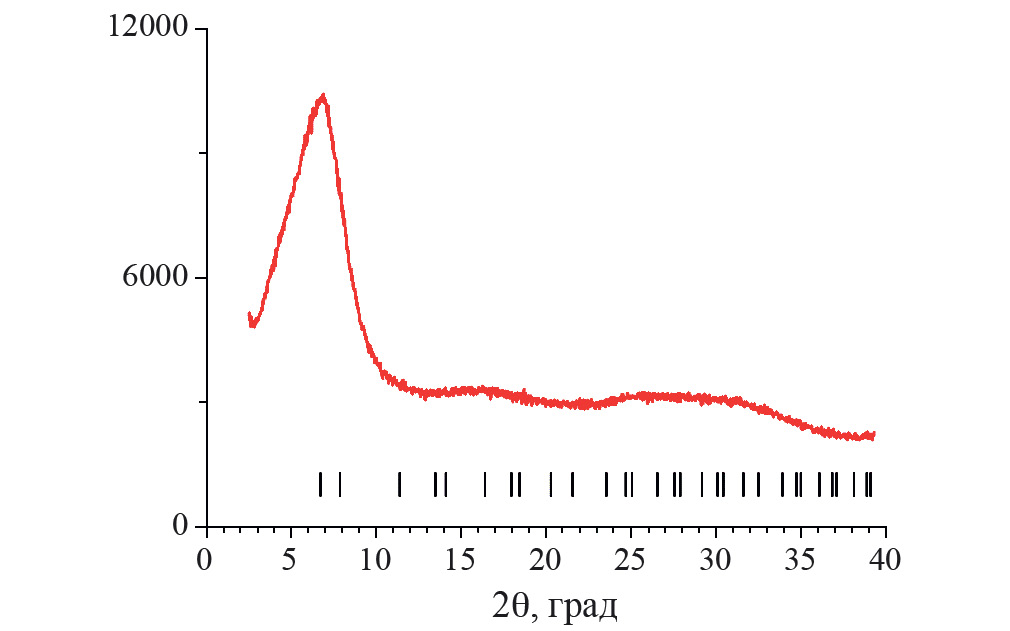Изучение физико-химических характеристик образца PET-UiO-66. На рентгеновской дифрактограмме материала PET-UiO-66 (рис. 2) можно видеть три очень широких пика, что указывает на чрезвычайно малые размеры областей когерентного рассеяния, не превышающие нескольких нанометров. В то же время, расположение этих пиков вполне соответствует положениям и относительным высотам пиков классической структуры UiO-66 с учетом их уширения из-за малых размеров кристаллитов.