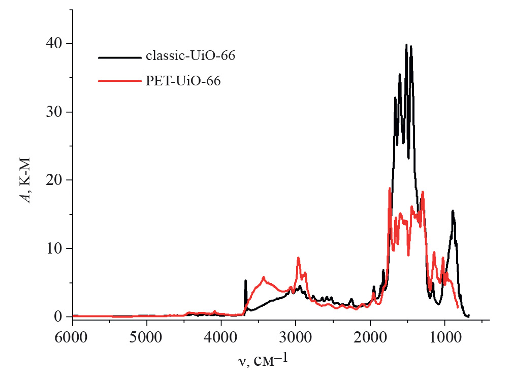 На рис. 5 представлены обзорные ИК-спектры образцов classic-UiO-66 и PET-UiO-66 после термовакуумной обработки (150°C).