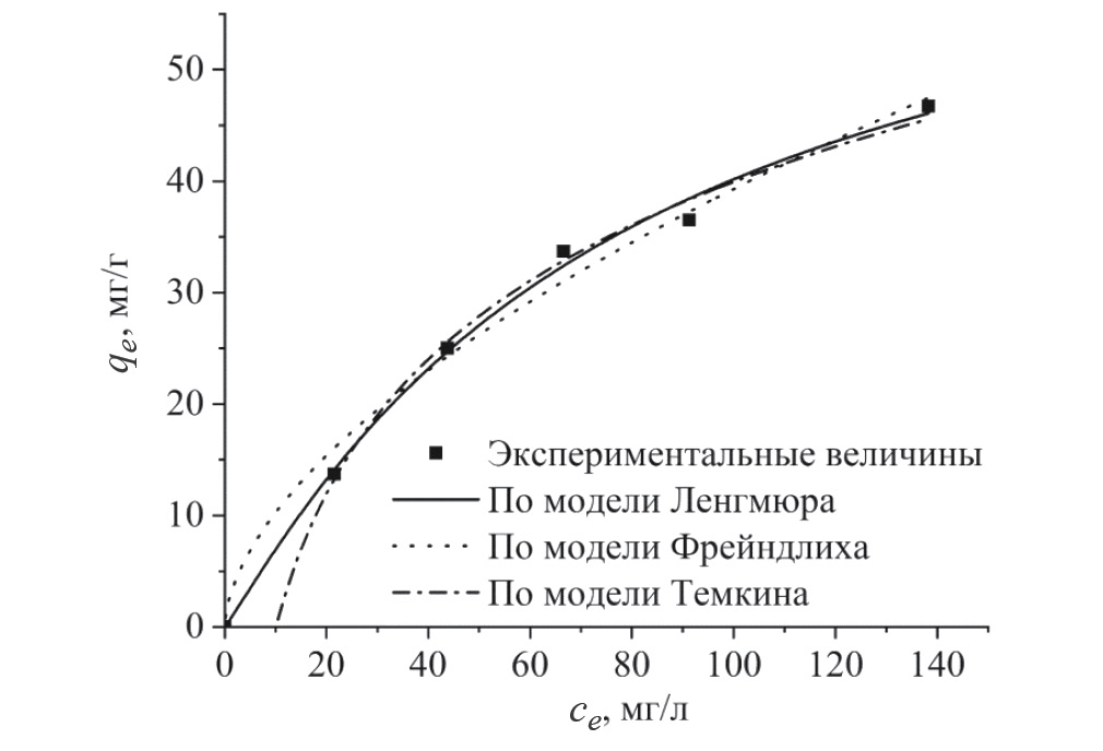 Три основные модели – Ленгмюра [43], Фрейндлиха [44] и Темкина [45] – были использованы для описания изотерм адсорбции тартразина на образце PET-UiO-66. Нелинейную форму изотермы Ленгмюра можно описать следующим образом: