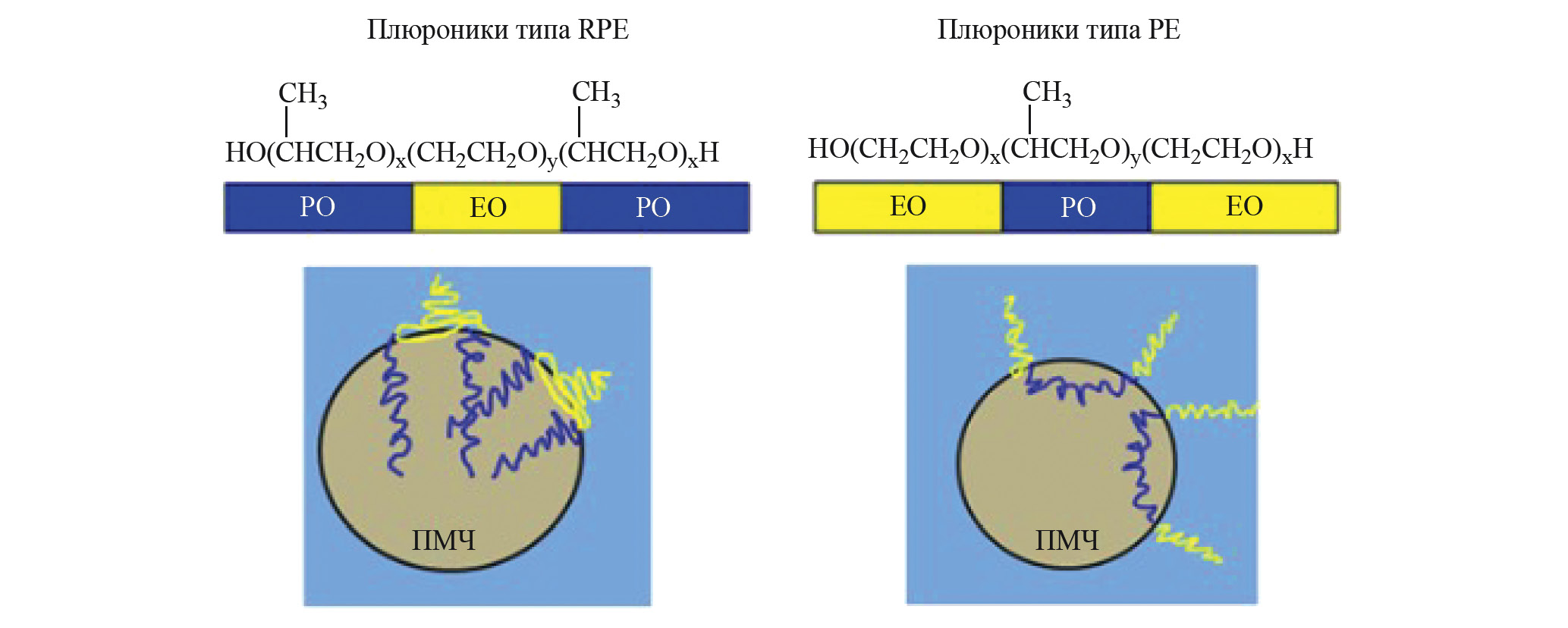 Рассчитанные величины максимальной адсорбции в рамках модели Ленгмюра, демонстрируют, что среди исследуемых ПАВ наибольшим значением Гмакс характеризуются плюроники Р123 и F68. Эти значения значительно превышают значения Гмакс для RPE3110. Полученные результаты указывают на то, что максимально возможное концентрирование ПАВ на межфазной границе наблюдается для ПАВ со строением этиленоксид–пропиленоксид–этиленоксид (рис. 1).
