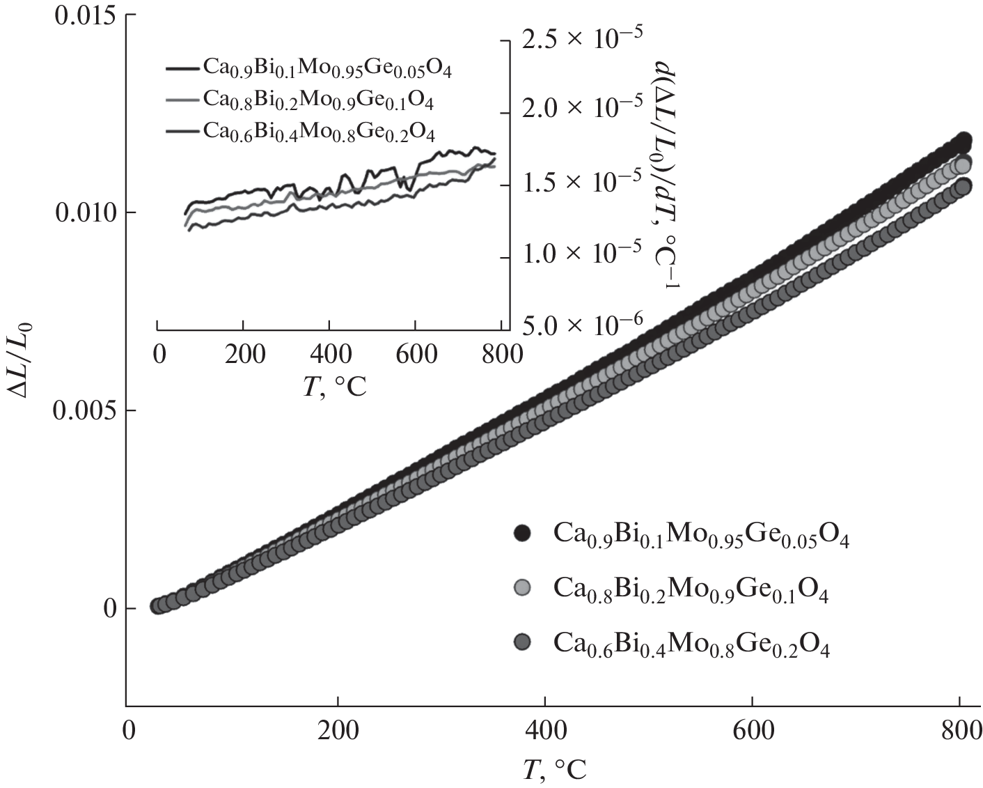 Ca1 – 2xBi2xMo1 – xGexO4 solid solutions with a scheelite-like structure (space group I41/a) and the homogeneity range х = 0.0–0.4 were prepared using standard ceramic technology. The unit cell parameter с and unit cell volume increase as the dopant concentration increases due to the changing size of Ca/BiO8 polyhedra. The predominant thermal expansion of Ca/BiO8 polyhedra was inferred from the temperature-dependent unit cell parameters and Raman spectral patterns. The Ca/Bi–O and Mo/Ge–O bond lengths were calculated. The increasing dopant concentration decreases the thermal expansion coefficient of the ceramics and increases the electrical conductivity and activation energy of the complex oxides compared to the matrix compound. The effective oxygen diffusion coefficient is determined.