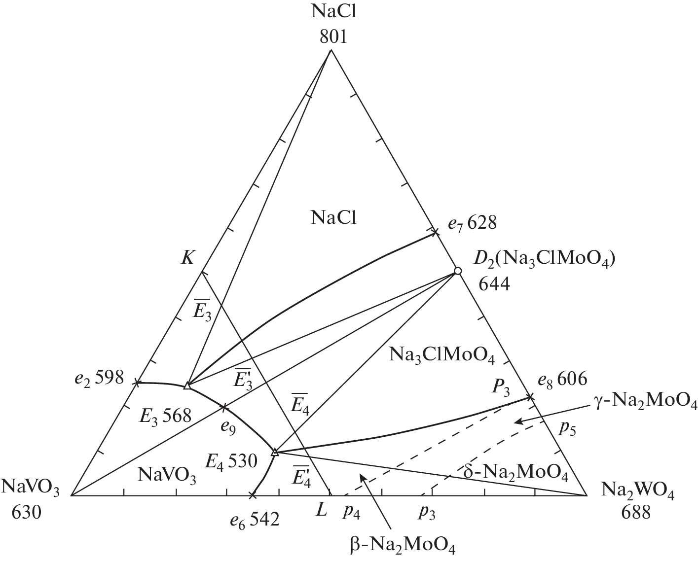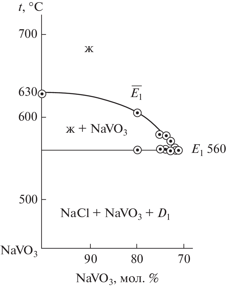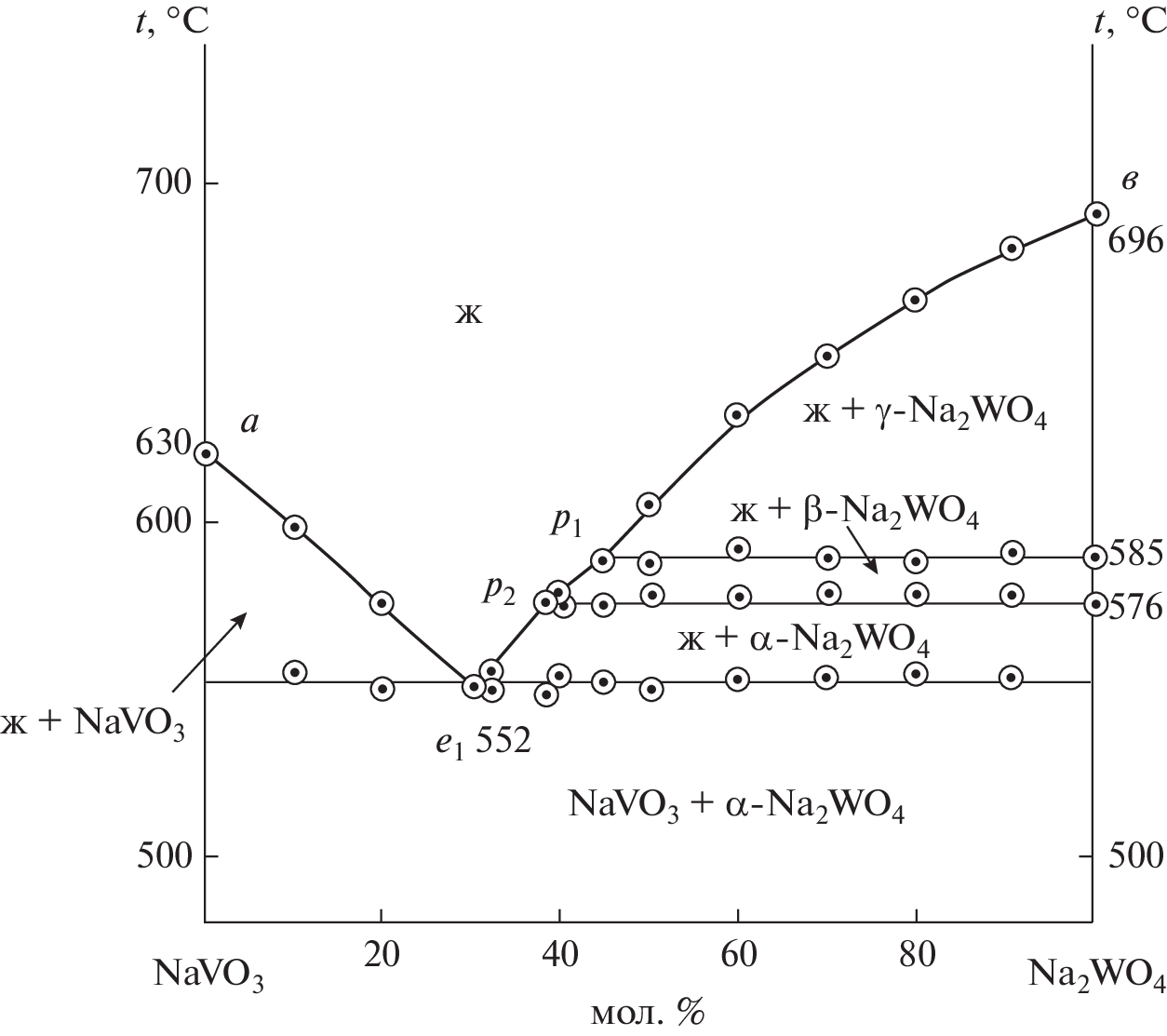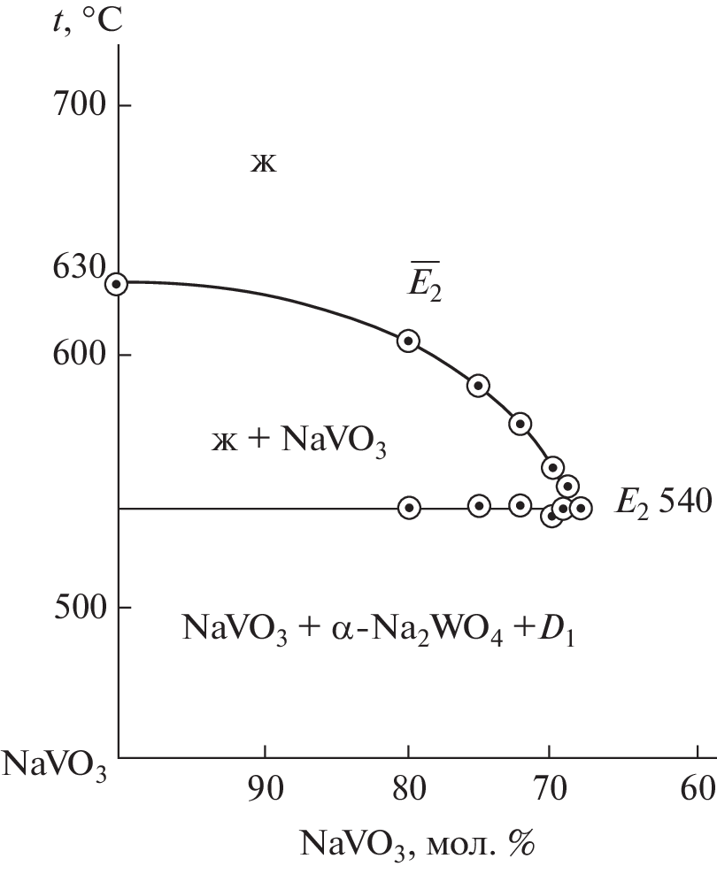 Phase equilibria in the NaVO3–Na2WO4 two-component system and in the NaCl–NaVO3–Na2EO4 (E = Mo or W) three-component system were studied. The phase assemblages of the NaCl–NaVO3–Na2EO4 (E = Mo or W) three-component systems were analyzed. Differential thermal analysis (DTA) showed that the binary system is a eutectic system and the three-component systems are partitioned by the compound Na3ClEO4 into two secondary triangles, in each of which eutectics were found. The percentages of the components in the ternary eutectics and their melting points were determined. Phase equilibria were described for all elements of the phase diagrams studied in this work. The Na2WO4 crystallization field is represented by α, β, and γ phases, and the Na2MoO4 crystallization field, by δ, γ, and β phases. The smallest crystallization field in the ternary systems belongs to low-melting NaVO3.