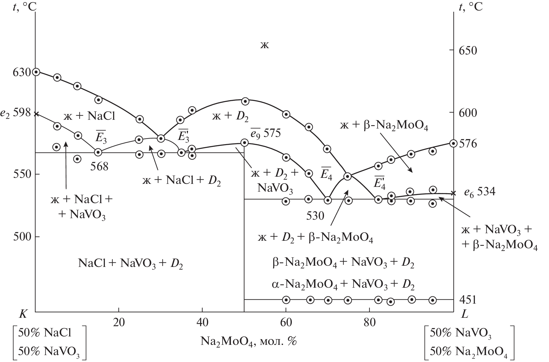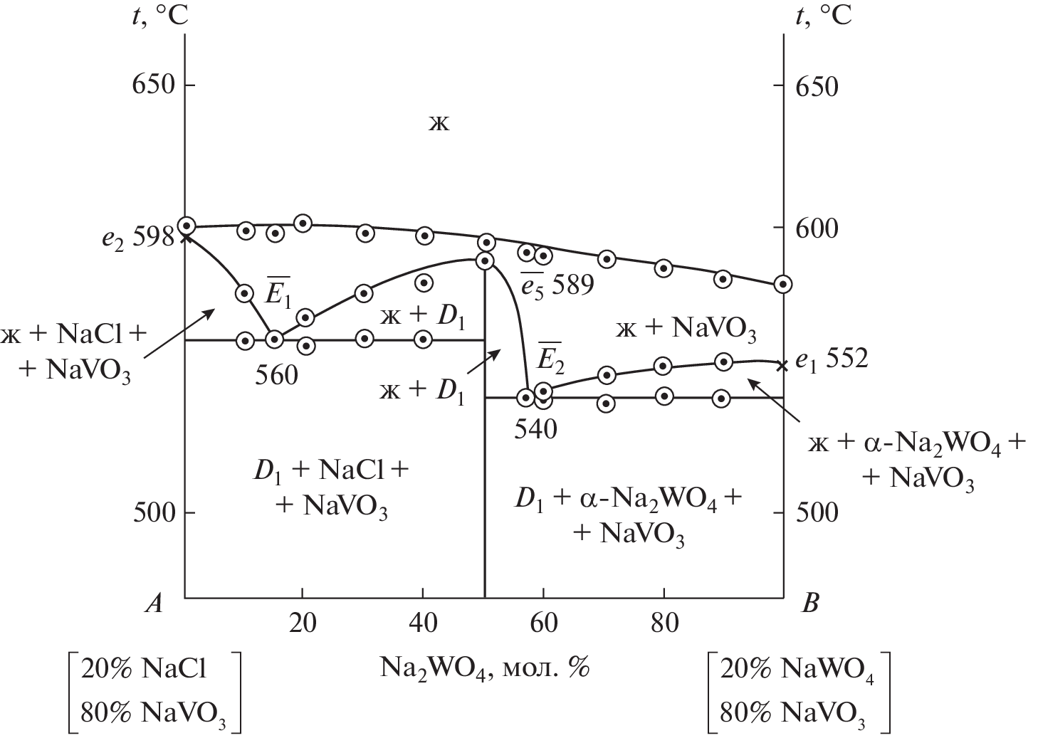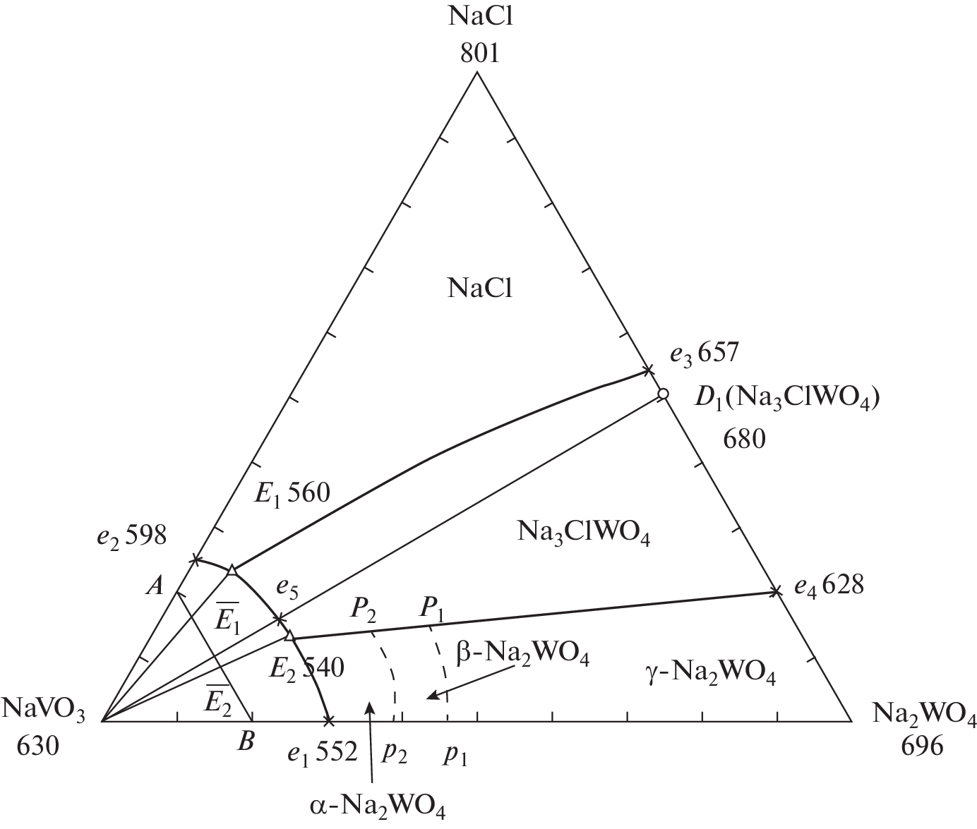 Phase equilibria in the NaVO3–Na2WO4 two-component system and in the NaCl–NaVO3–Na2EO4 (E = Mo or W) three-component system were studied. The phase assemblages of the NaCl–NaVO3–Na2EO4 (E = Mo or W) three-component systems were analyzed. Differential thermal analysis (DTA) showed that the binary system is a eutectic system and the three-component systems are partitioned by the compound Na3ClEO4 into two secondary triangles, in each of which eutectics were found. The percentages of the components in the ternary eutectics and their melting points were determined. Phase equilibria were described for all elements of the phase diagrams studied in this work. The Na2WO4 crystallization field is represented by α, β, and γ phases, and the Na2MoO4 crystallization field, by δ, γ, and β phases. The smallest crystallization field in the ternary systems belongs to low-melting NaVO3.
