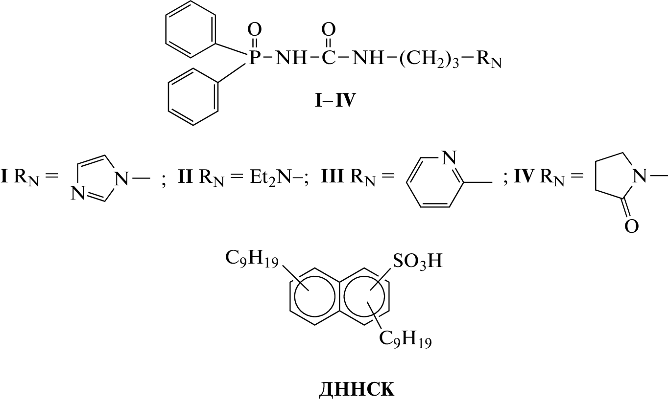 Extraction of uranium, thorium, and lanthanide(III) ions from nitric acid solutions with mixtures of dinonylnaphthalenesulfonic acid and N-(diphenylphosphoryl)-N'-n-propylureas containing imidazolyl, diethylamino, pyrid-2-yl, and 2-oxopyrrolidine fragments has been studied in organic solvents. Considerable synergetic effect on extraction of metal ions with mixtures of dinonylnaphthalenesulfonic acid and N-(diphenylphosphoryl)-N'-[3-(2-oxopyrrolidino)propyl]urea has been revealed. Stoichiometry of extracted complexes has been determined. Effect of extractant strucuture, organic diluent nature, and HNO3 content in aqueous phase on extraction efficiency of metal cations into organic medium has been accessed.